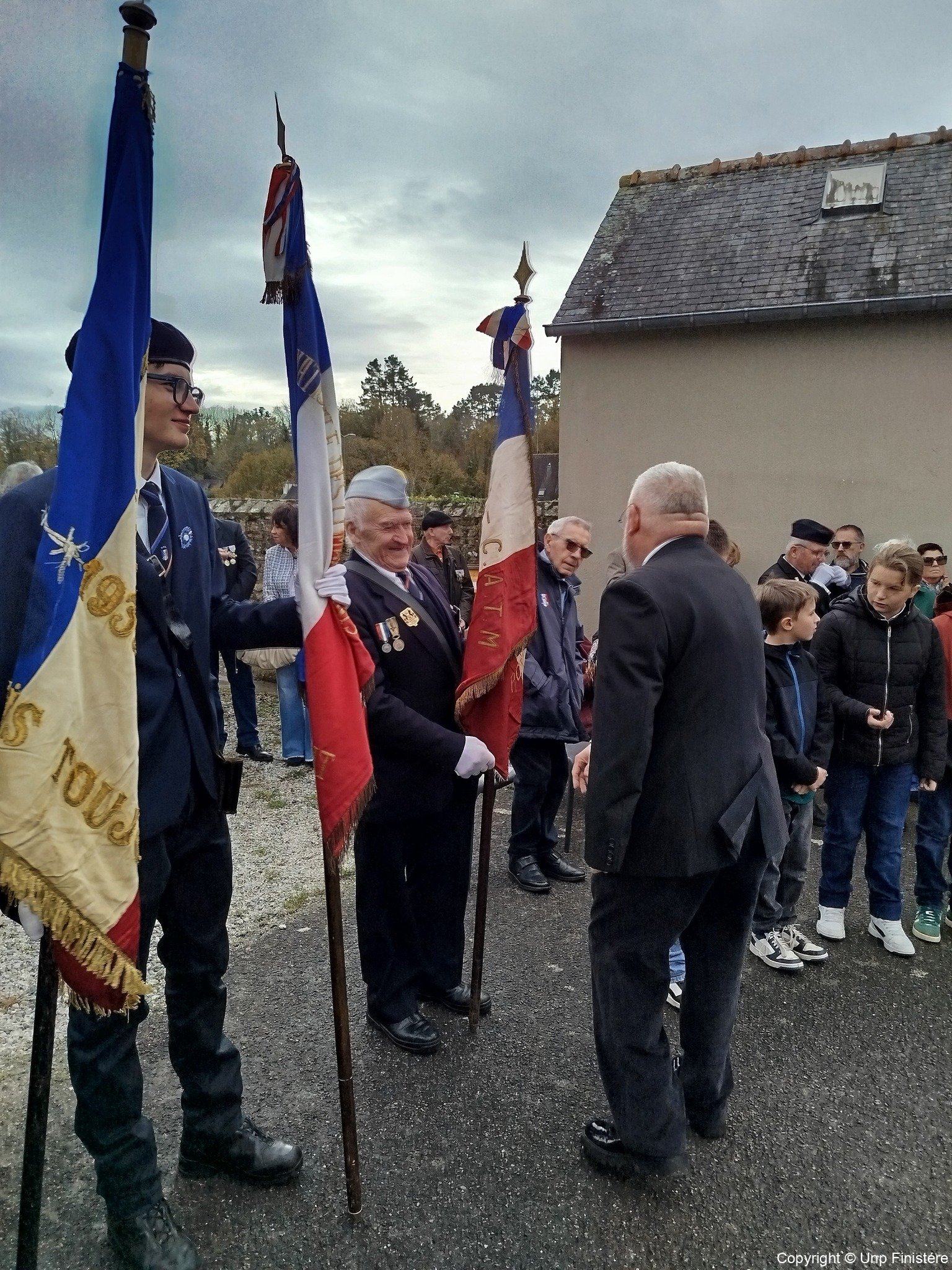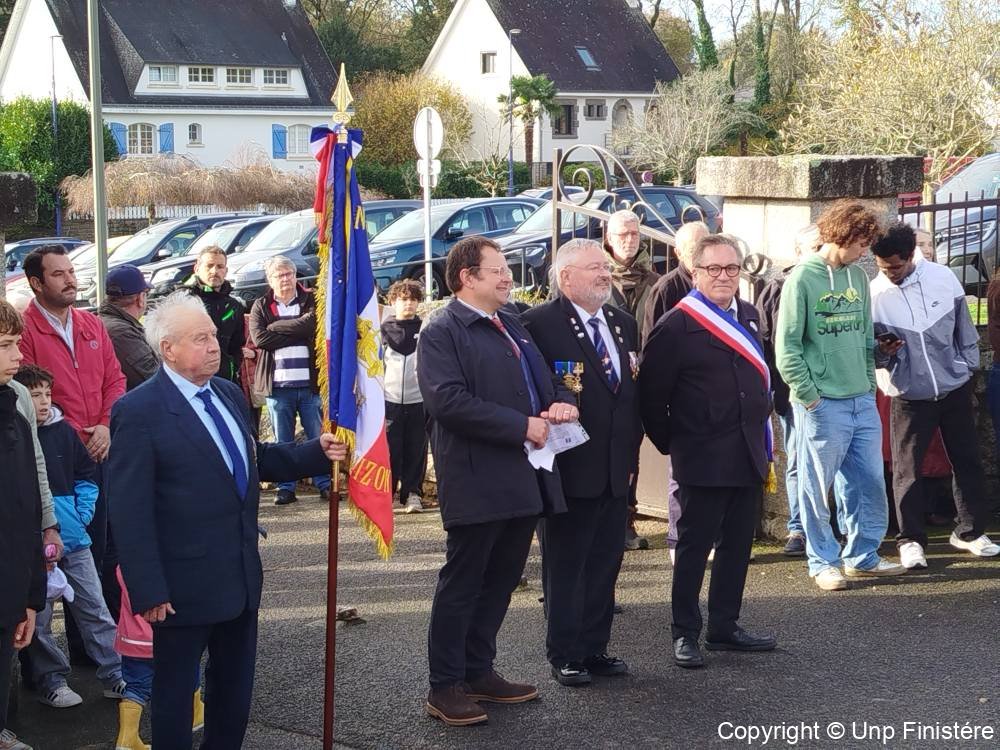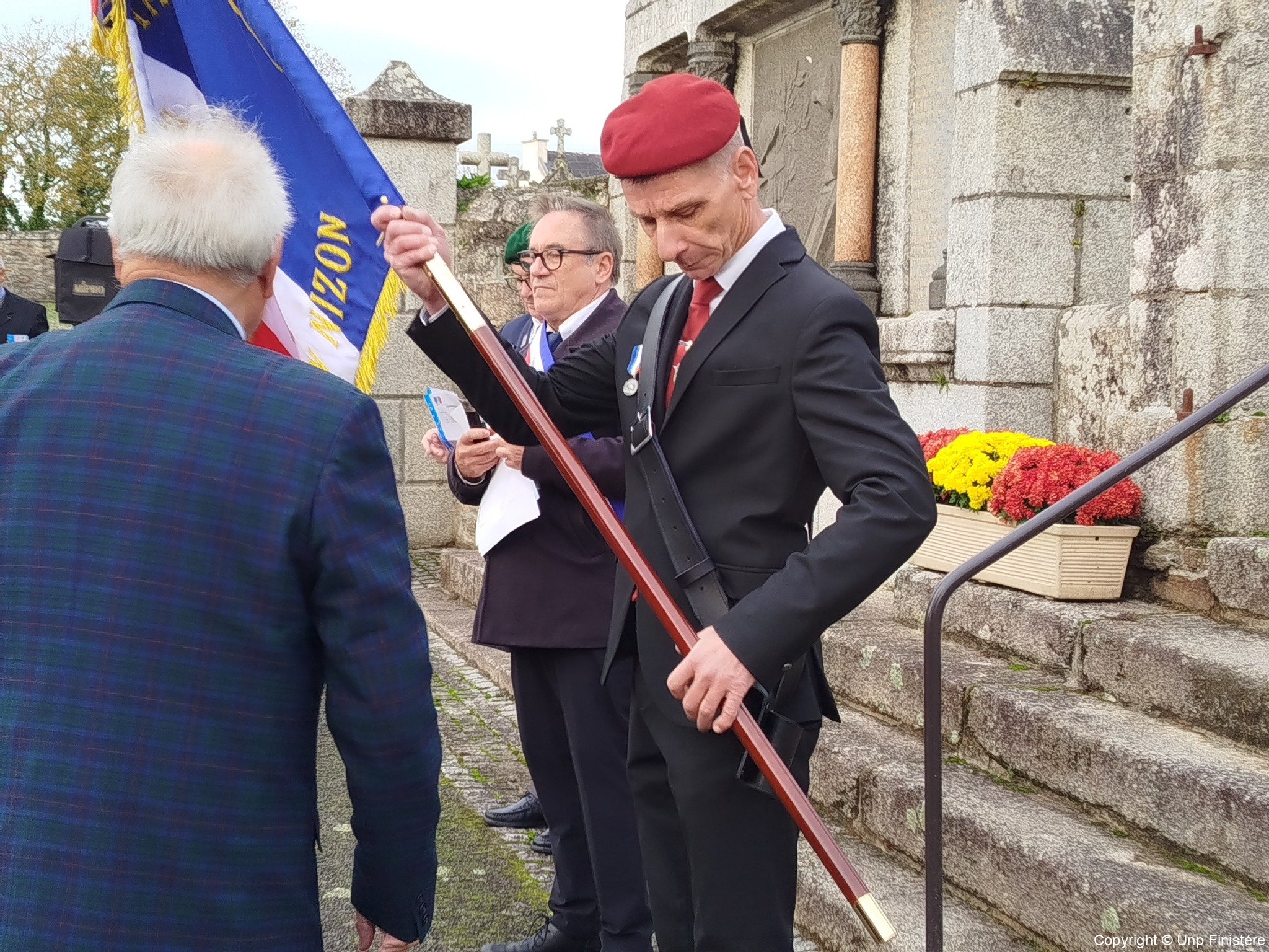 Après ces lectures, Monsieur le Maire qui représentait Monsieur Maël DE CALAN, Président du Conseil Départemental du Finistère, a remis à Monsieur Bruno MANGIN, Porte-Drapeau de l’UNC locale, le nouveau drapeau siglés « AFN ».