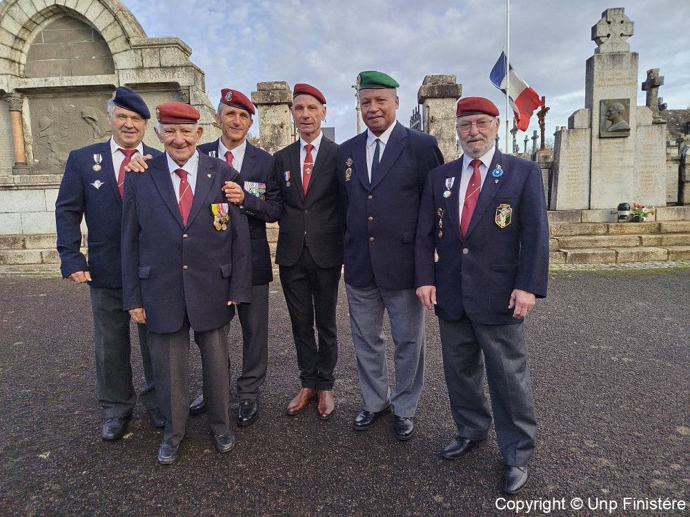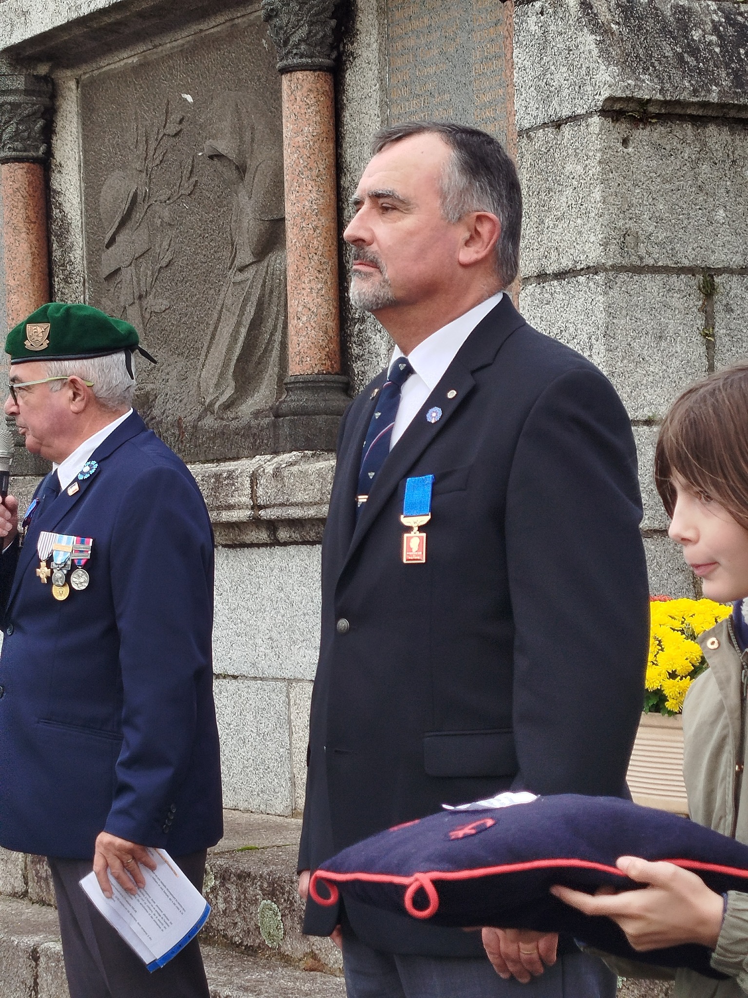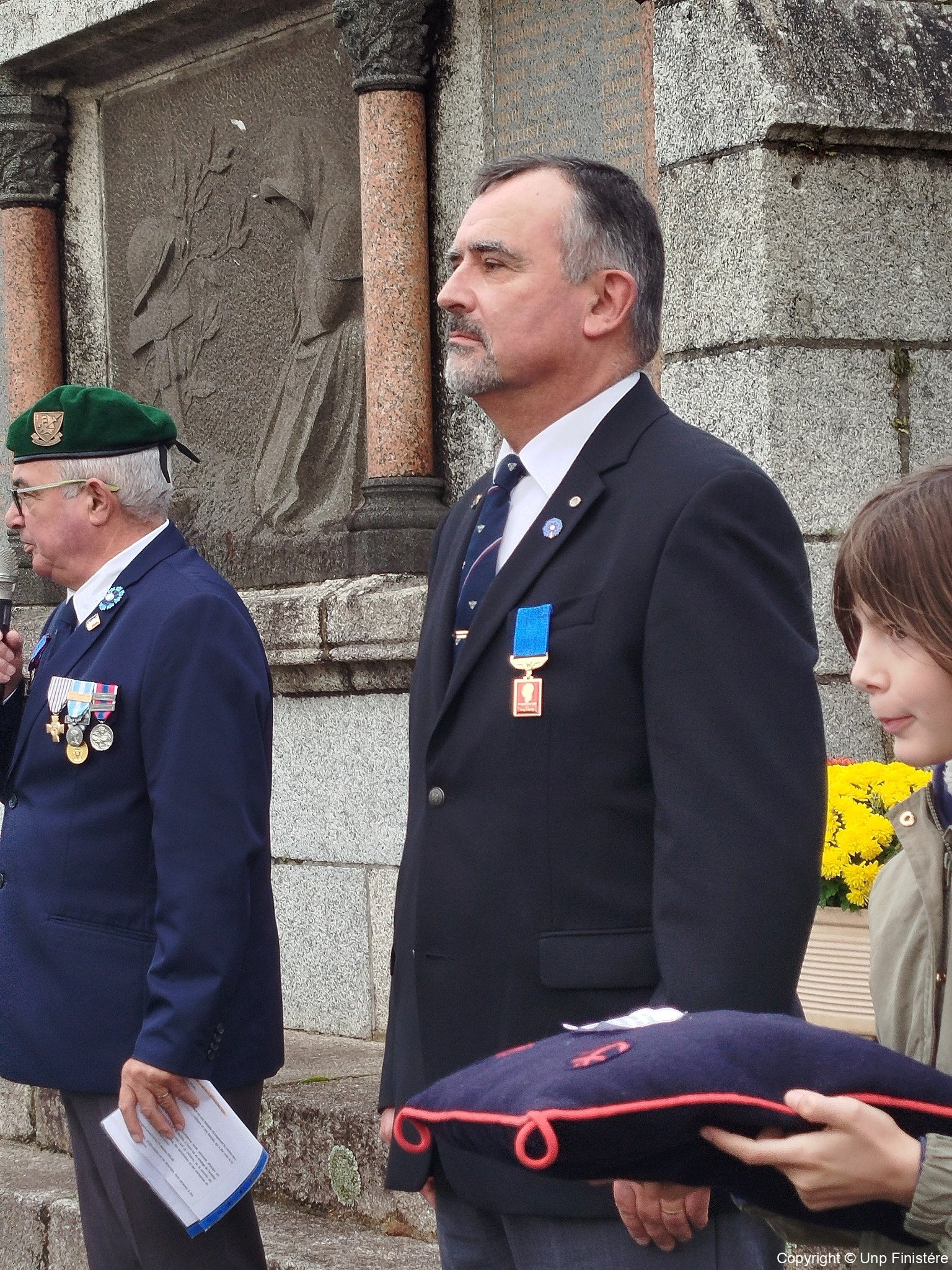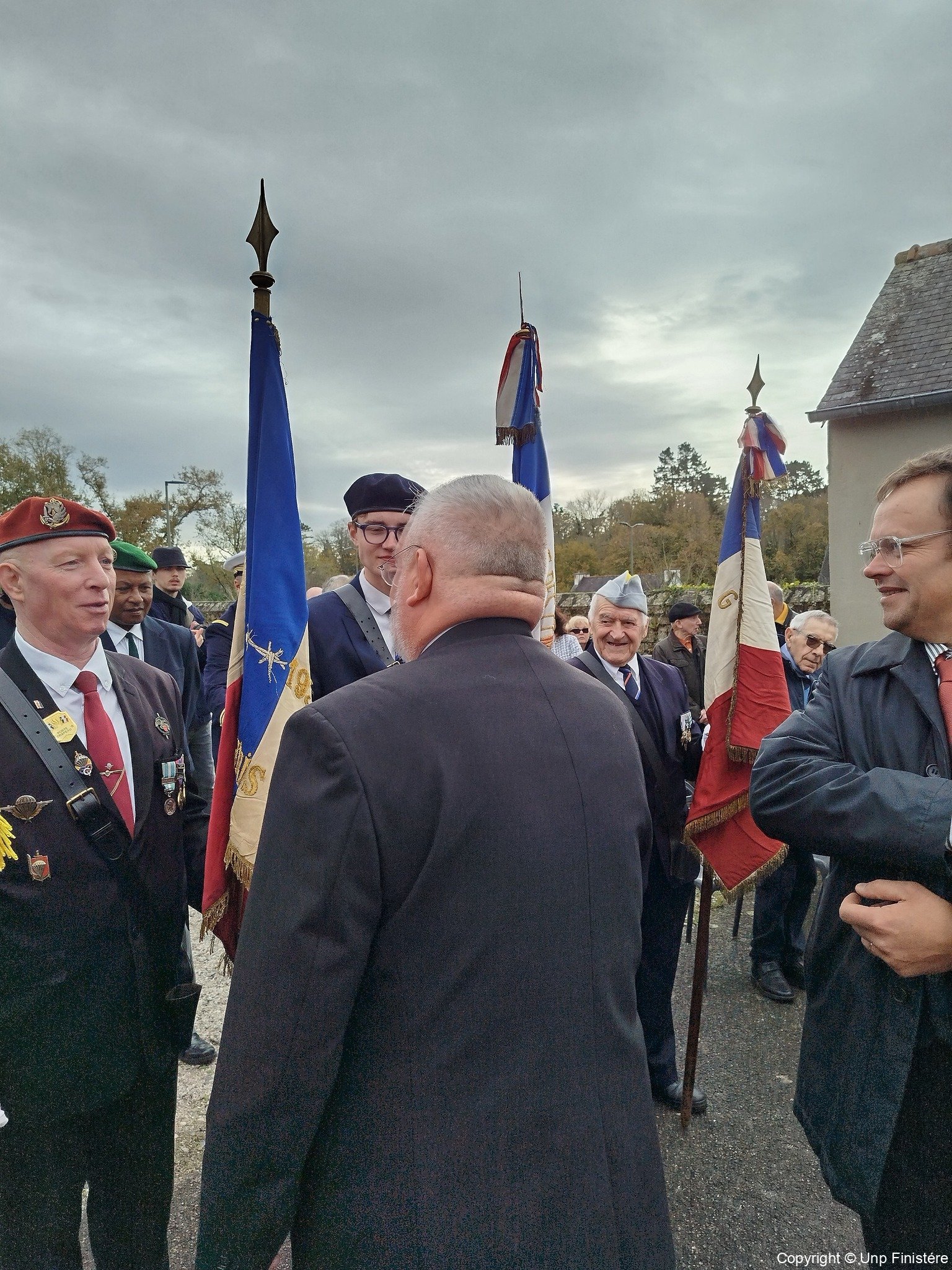 Après ces lectures, Monsieur le Maire qui représentait Monsieur Maël DE CALAN, Président du Conseil Départemental du Finistère, a remis à Monsieur Bruno MANGIN, Porte-Drapeau de l’UNC locale, le nouveau drapeau siglés « AFN ».