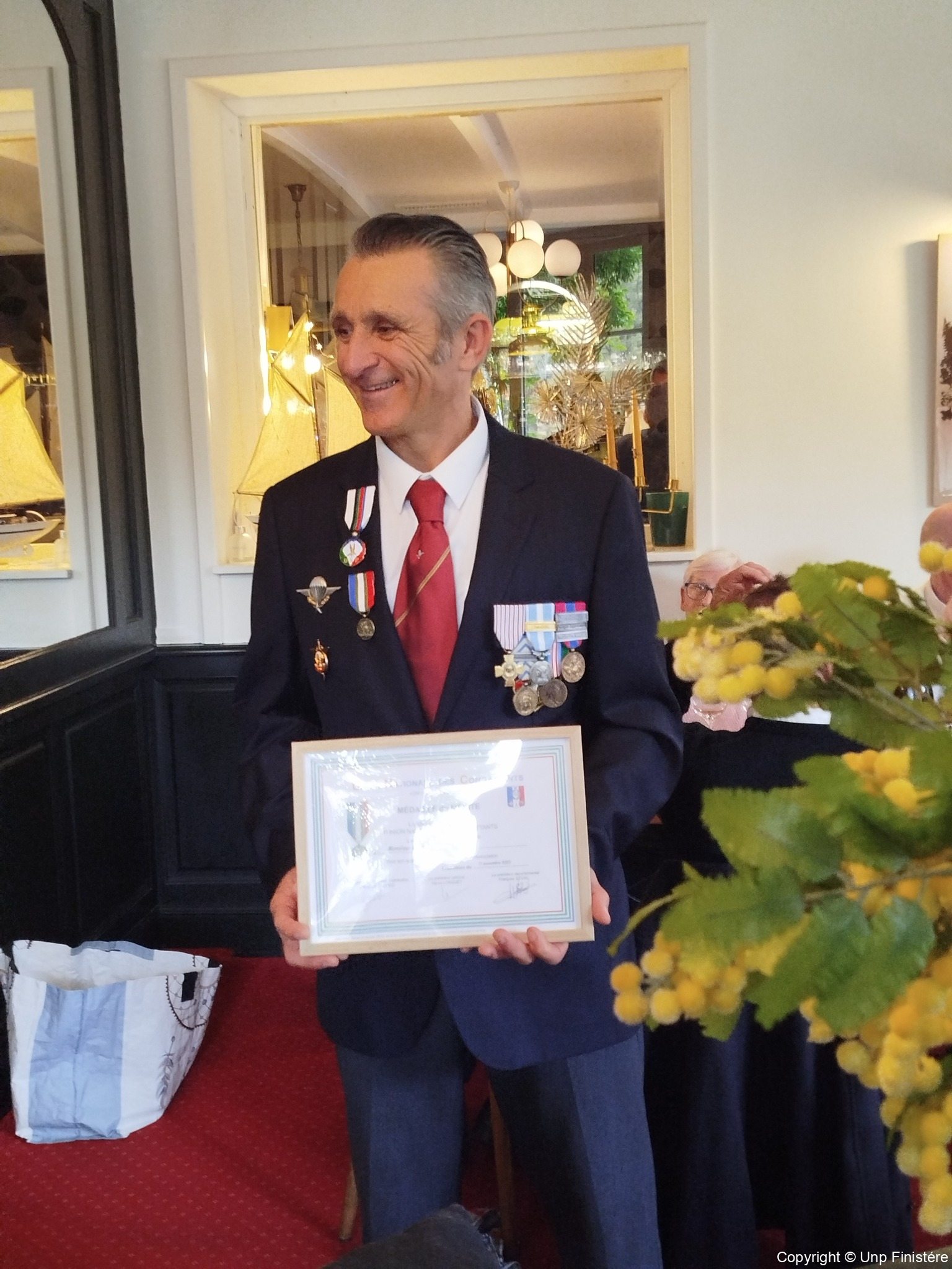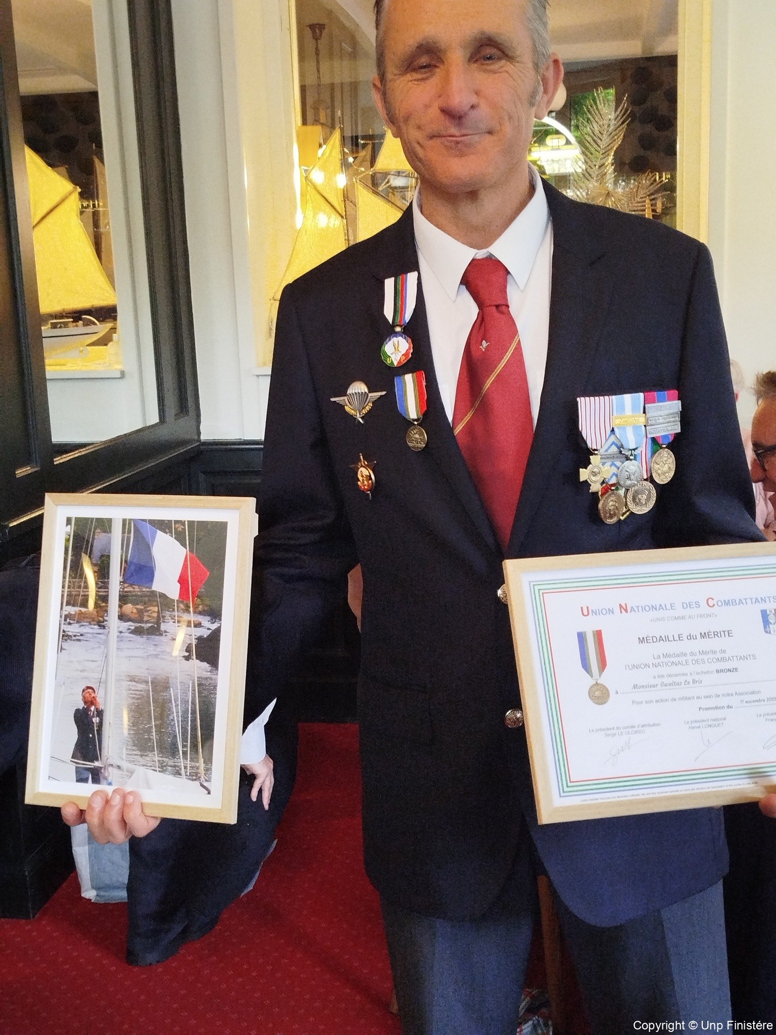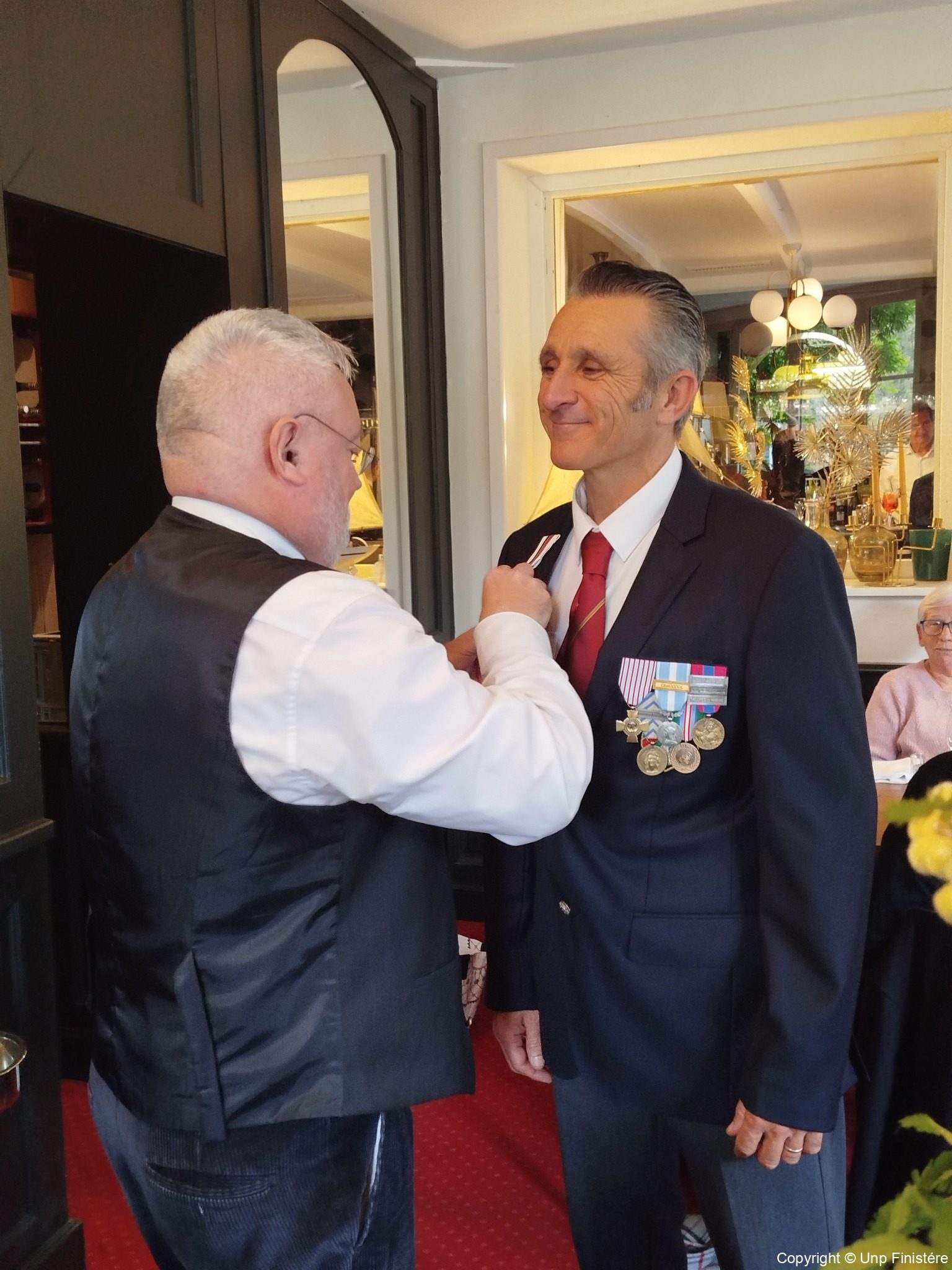 Avant le dessert, Christophe EVENO, Président de l’UNC locale, a remis à Gweltaz LE BRIS, membre de l’UNP Finistère et de l’UNC Pont-Aven, la médaille du Mérite pour l’ensemble des services qu’il a rendus.
