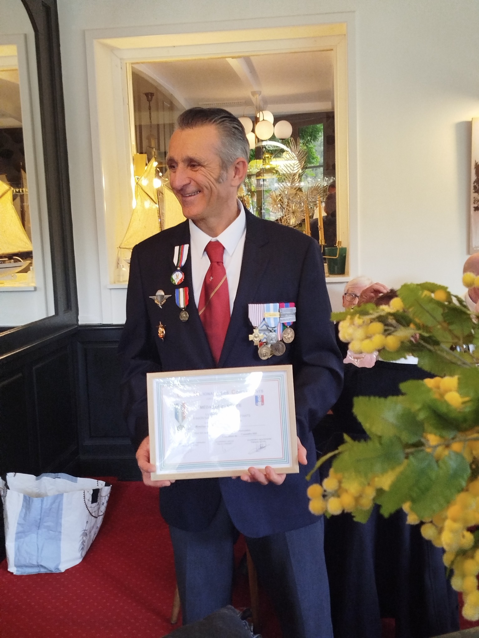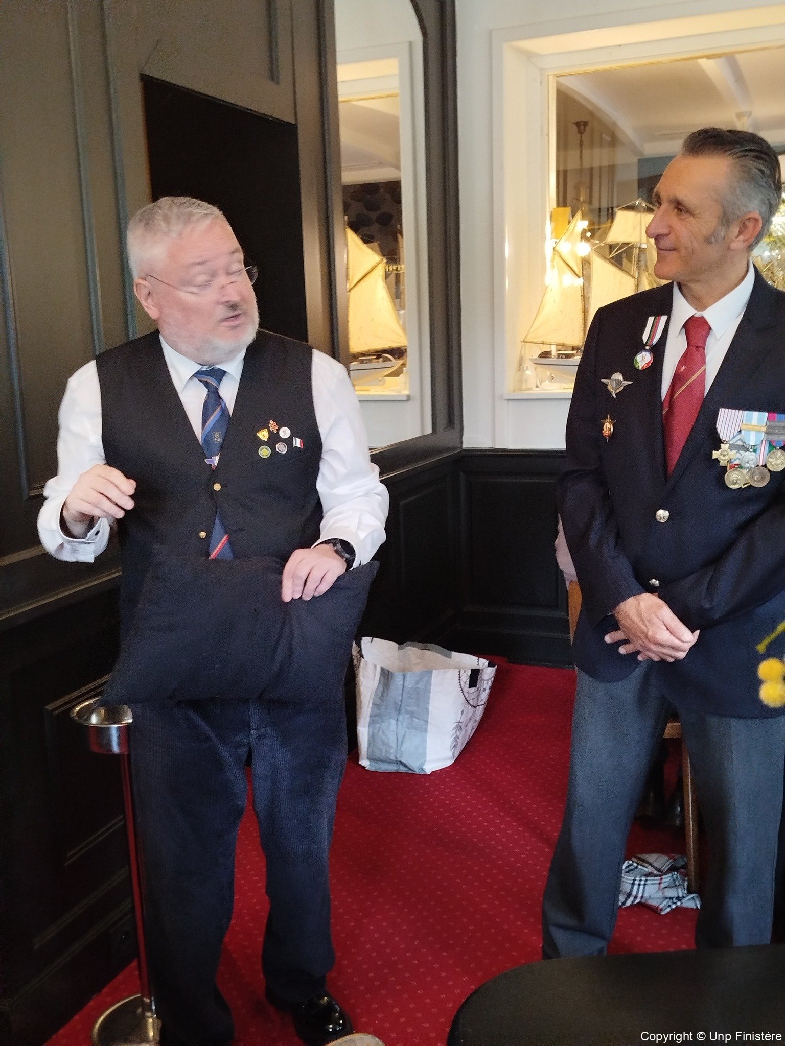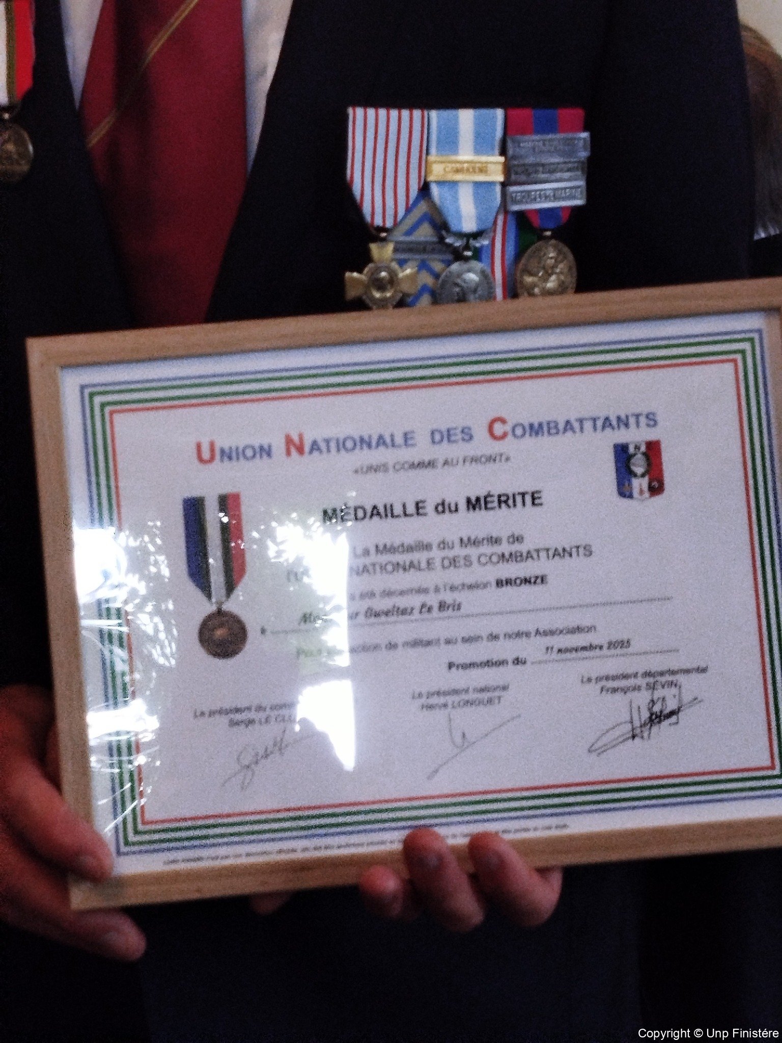 Avant le dessert, Christophe EVENO, Président de l’UNC locale, a remis à Gweltaz LE BRIS, membre de l’UNP Finistère et de l’UNC Pont-Aven, la médaille du Mérite pour l’ensemble des services qu’il a rendus.