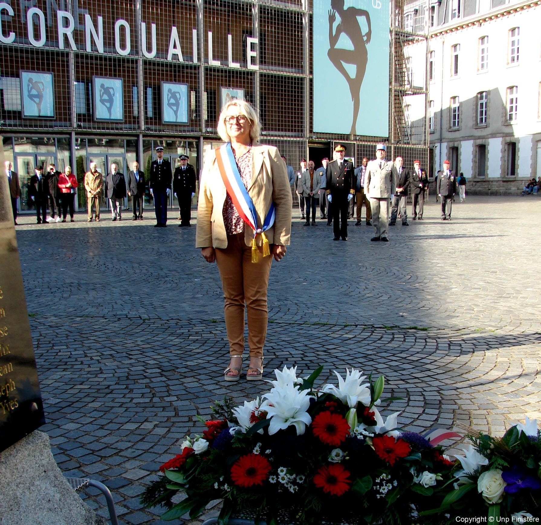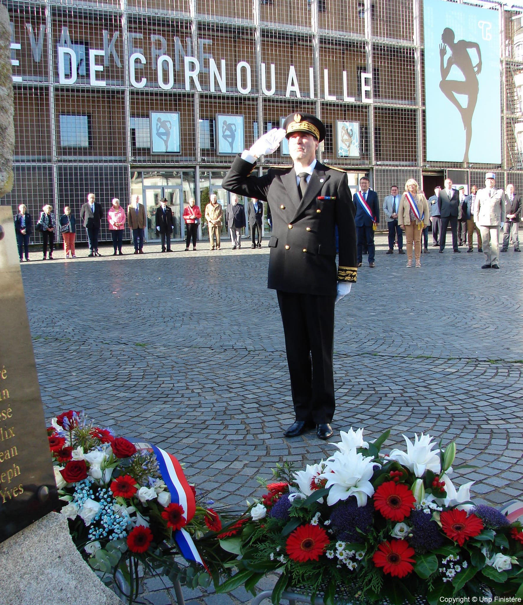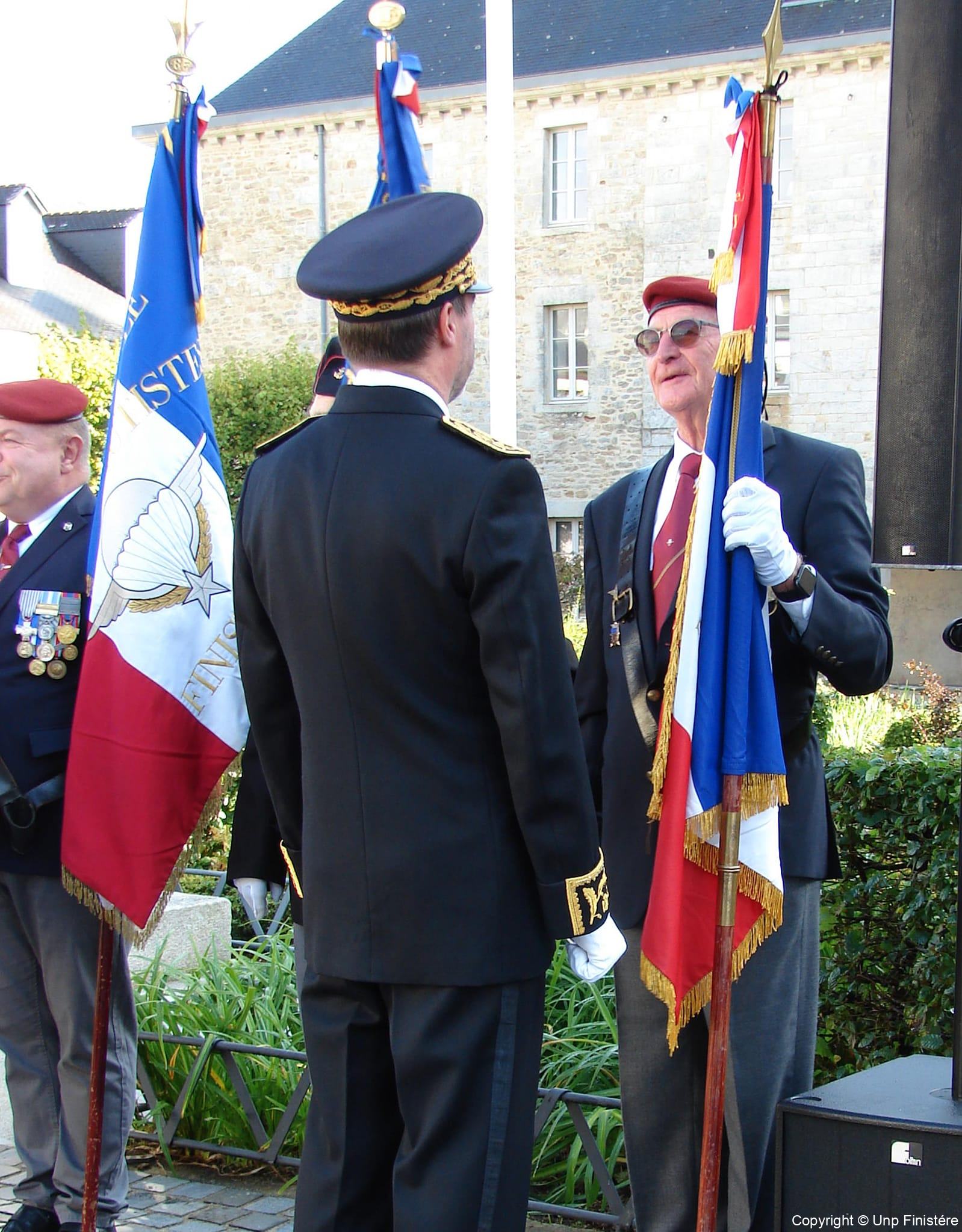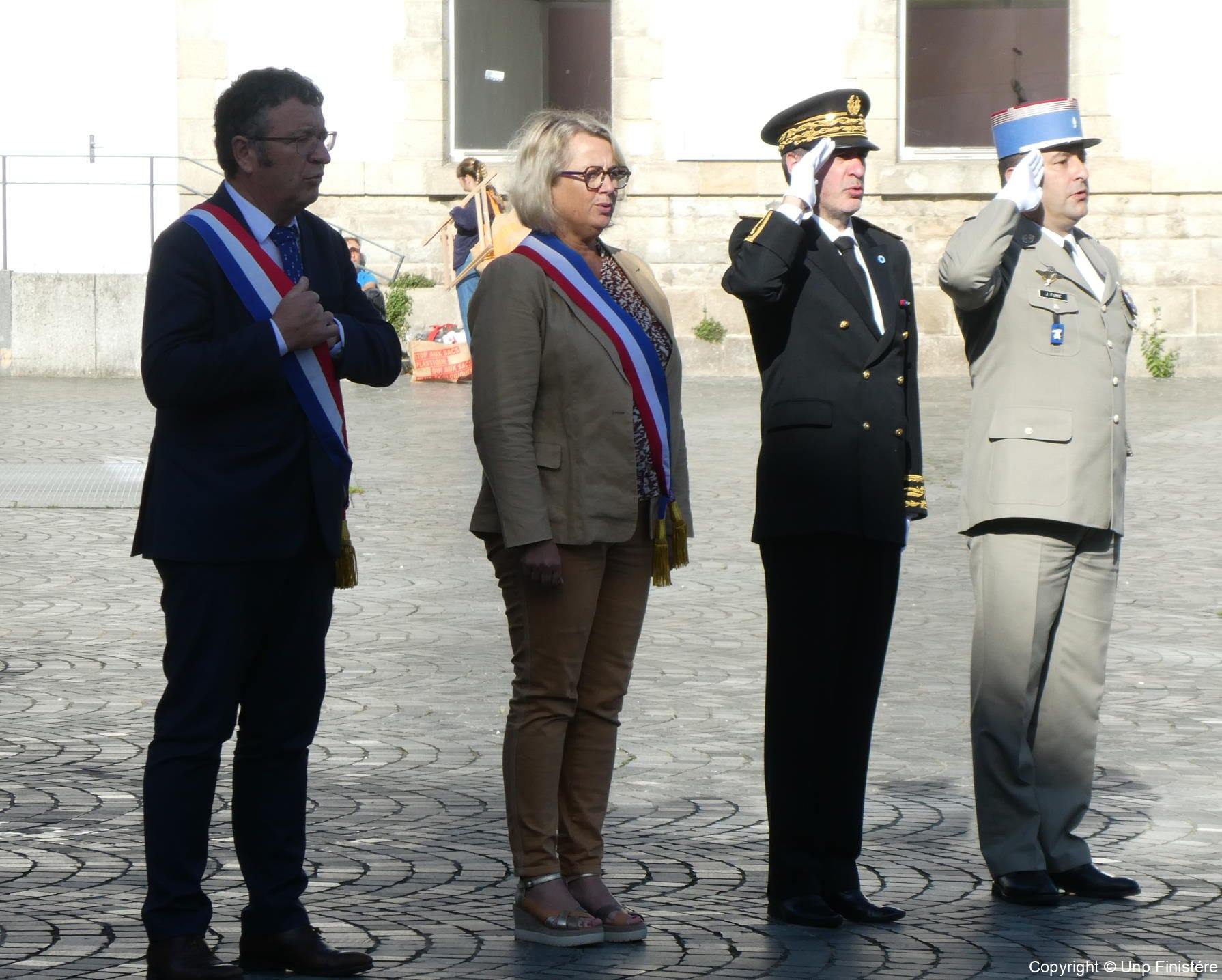 Des élus locaux, Madame la colonelle commandant la gendarmerie du Finistère, le Directeur de l’Office National des Anciens Combattants du Finistère, le Directeur départemental de la Sécurité Publique. Présence d’élus, des associations patriotiques, accompagnées de 14 porte-drapeaux.