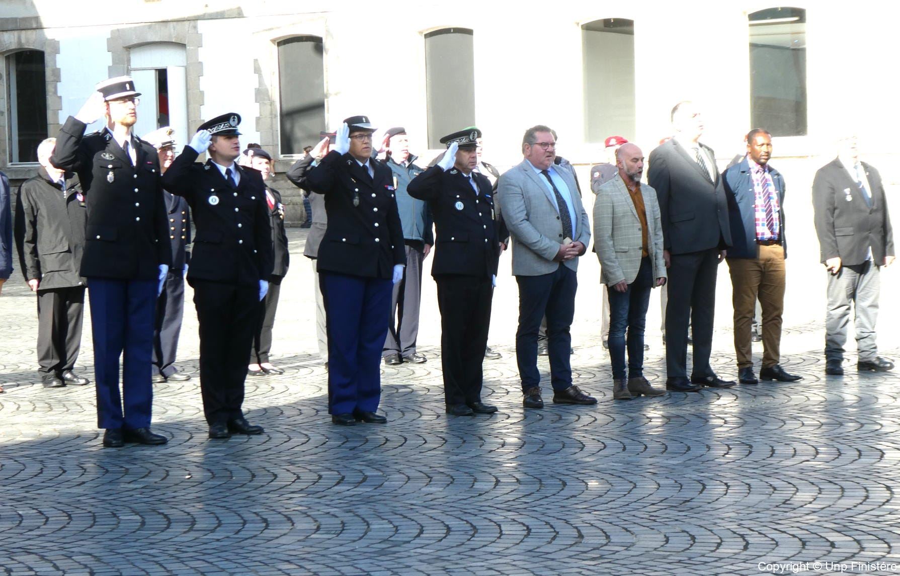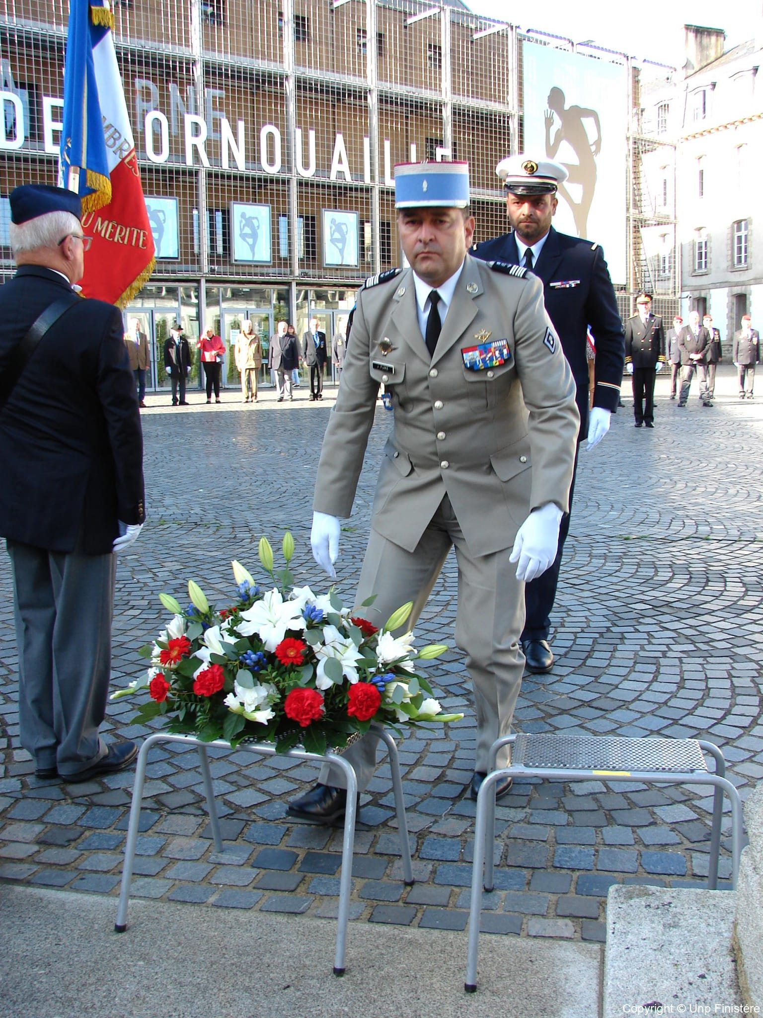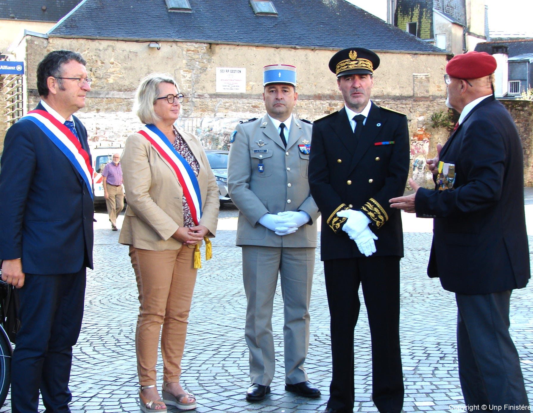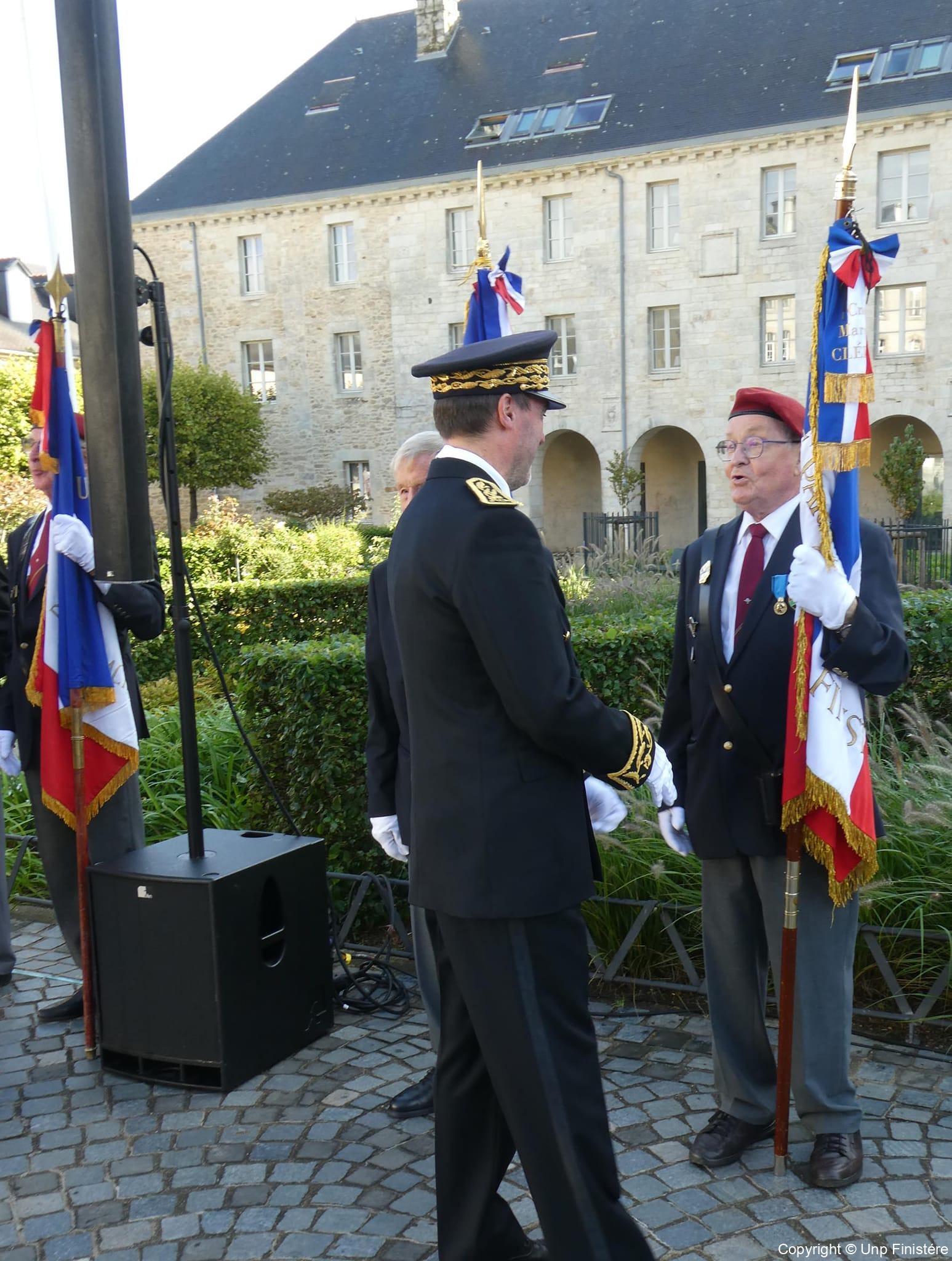 Des élus locaux, Madame la colonelle commandant la gendarmerie du Finistère, le Directeur de l’Office National des Anciens Combattants du Finistère, le Directeur départemental de la Sécurité Publique. Présence d’élus, des associations patriotiques, accompagnées de 14 porte-drapeaux.
