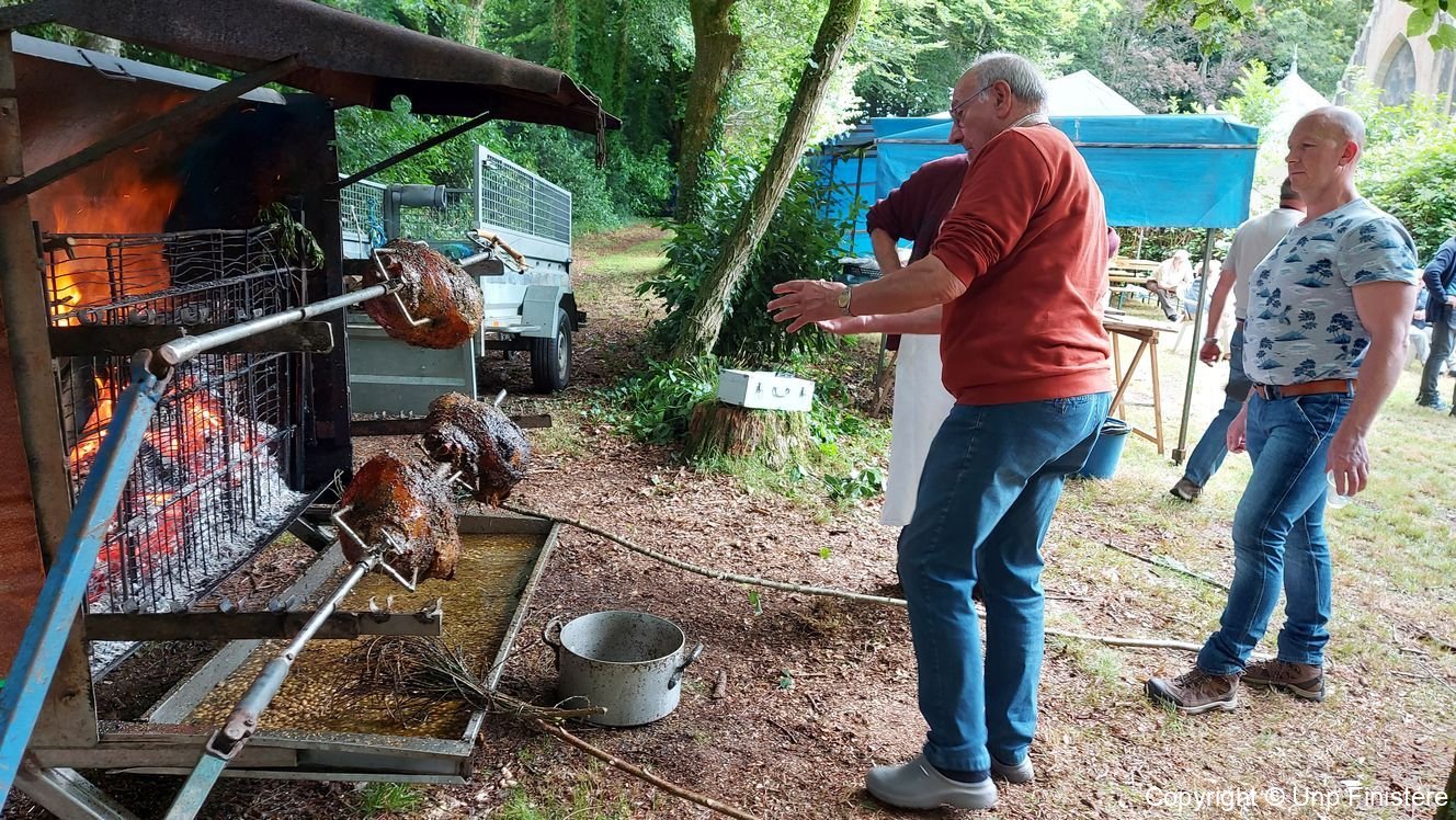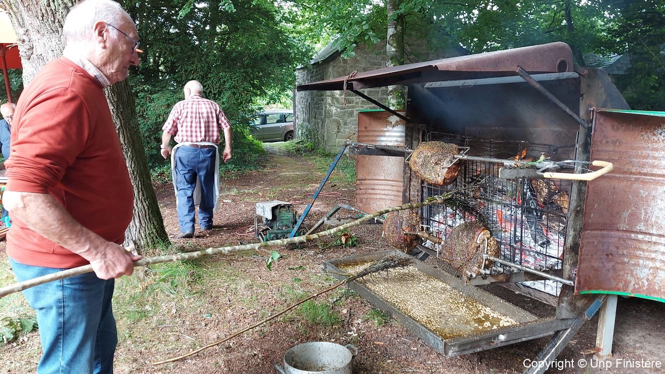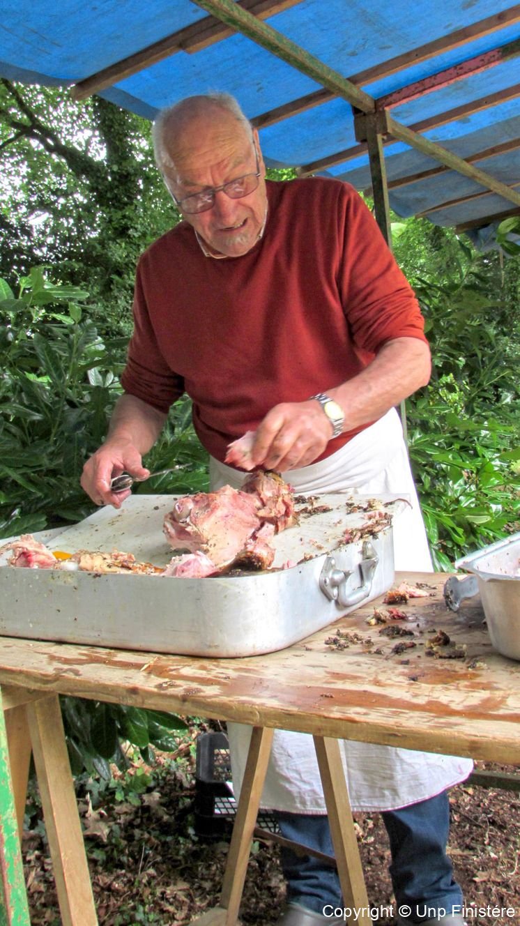 Discrètement les « Volontaires » rejoignaient leur poste, prêt à mettre en action, la chaîne de distribution du repas. Le jambon badigeonné et arrosé depuis des heures, était fin prêt pour la dégustation. L’équipe de la rôtissoire depuis sept du matin avait bien œuvré, les jambons prêts à la découpe avaient belle allure et une odeur très agréable se répandait autour de ce point de cuisson. En guise de salle de restauration, le magnifique barnum prêté par la mairie de Plogonnec. Le jambon grillé accompagné d’haricots blancs et frites, fit un malheur. A noter la sauce exquise qui avait un merveilleux goût venu d’ailleurs. Une fois la totalité de nos convives servis, ce fut autour des épouses disponibles de nous ravitailler en pain, fromage et dessert. Tout s’enchaînait à merveille.