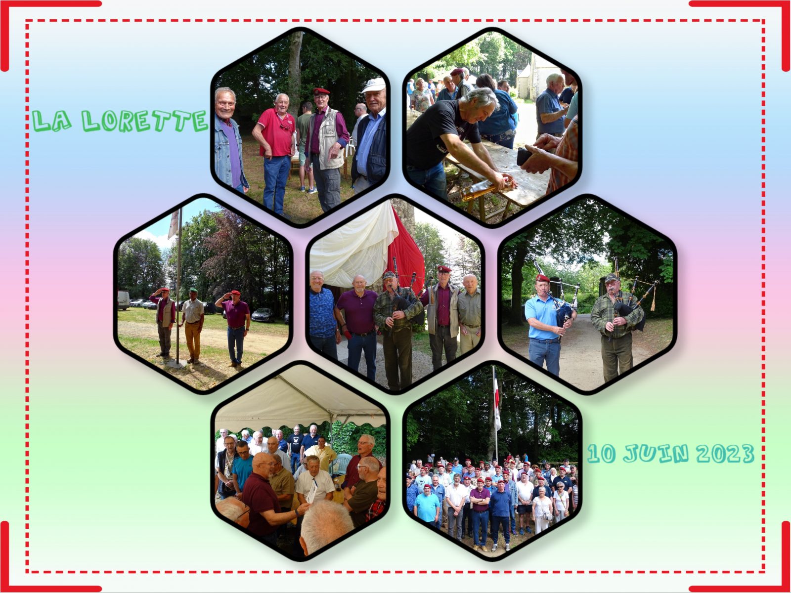12H00 Christian et André sonne le rassemblement devant le mât des couleurs. Bérets vissés sur la tête, le carré est réalisé. Nos épouses et compagnes se sont jointes à nous. Comme tous les ans le maire de la commune, monsieur Didier Leroy a répondu à notre invitation. André avec son clairon accentue le côté cérémonial de ce rassemblement. Une belle Marseillaise chantée à capella est entonnée par les parachutistes et participants. Un mot de remerciement est adressé à monsieur le Maire ainsi qu’à notre amie Annie, présidente de l’association » Les Amis de la Lorette « .