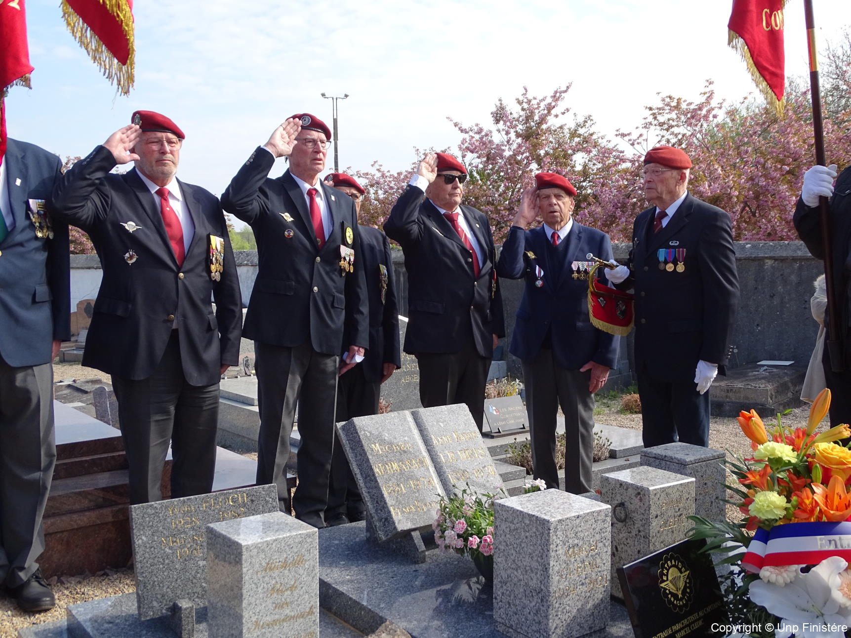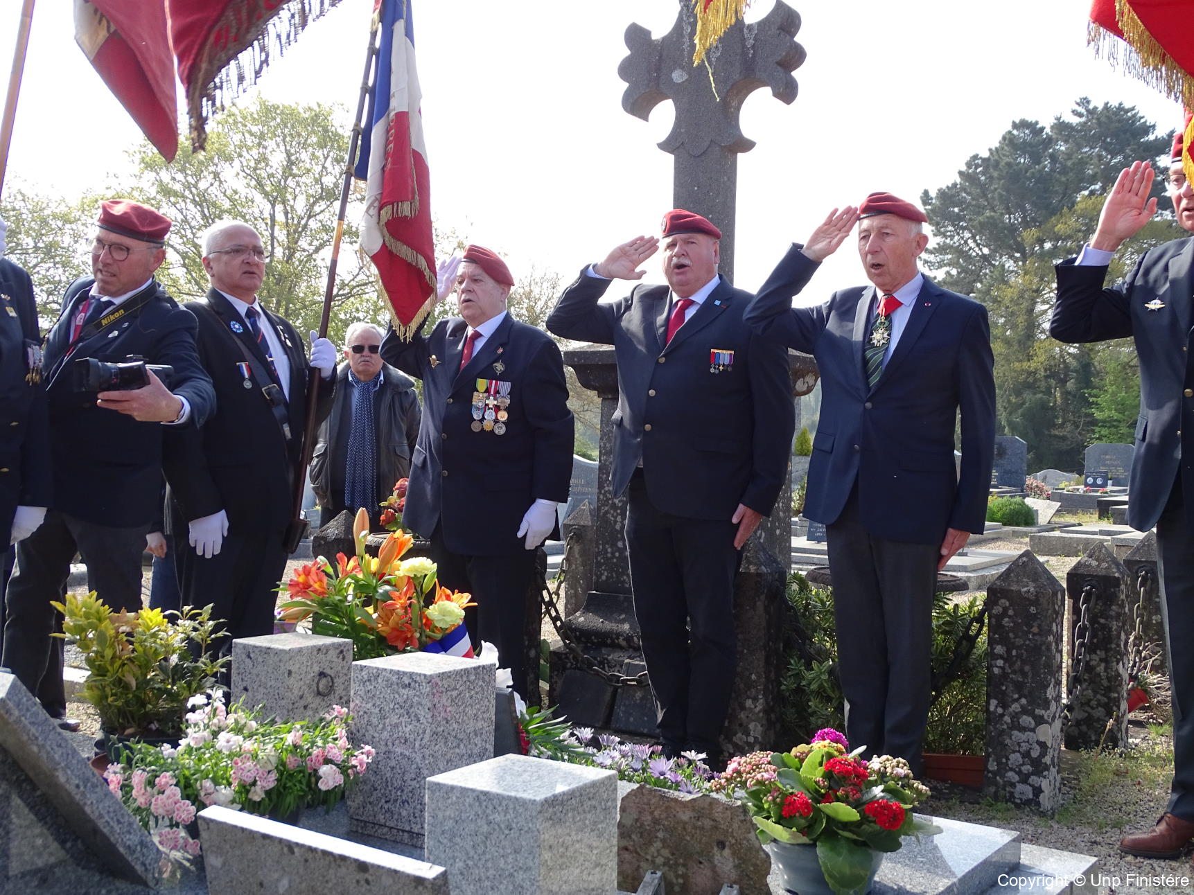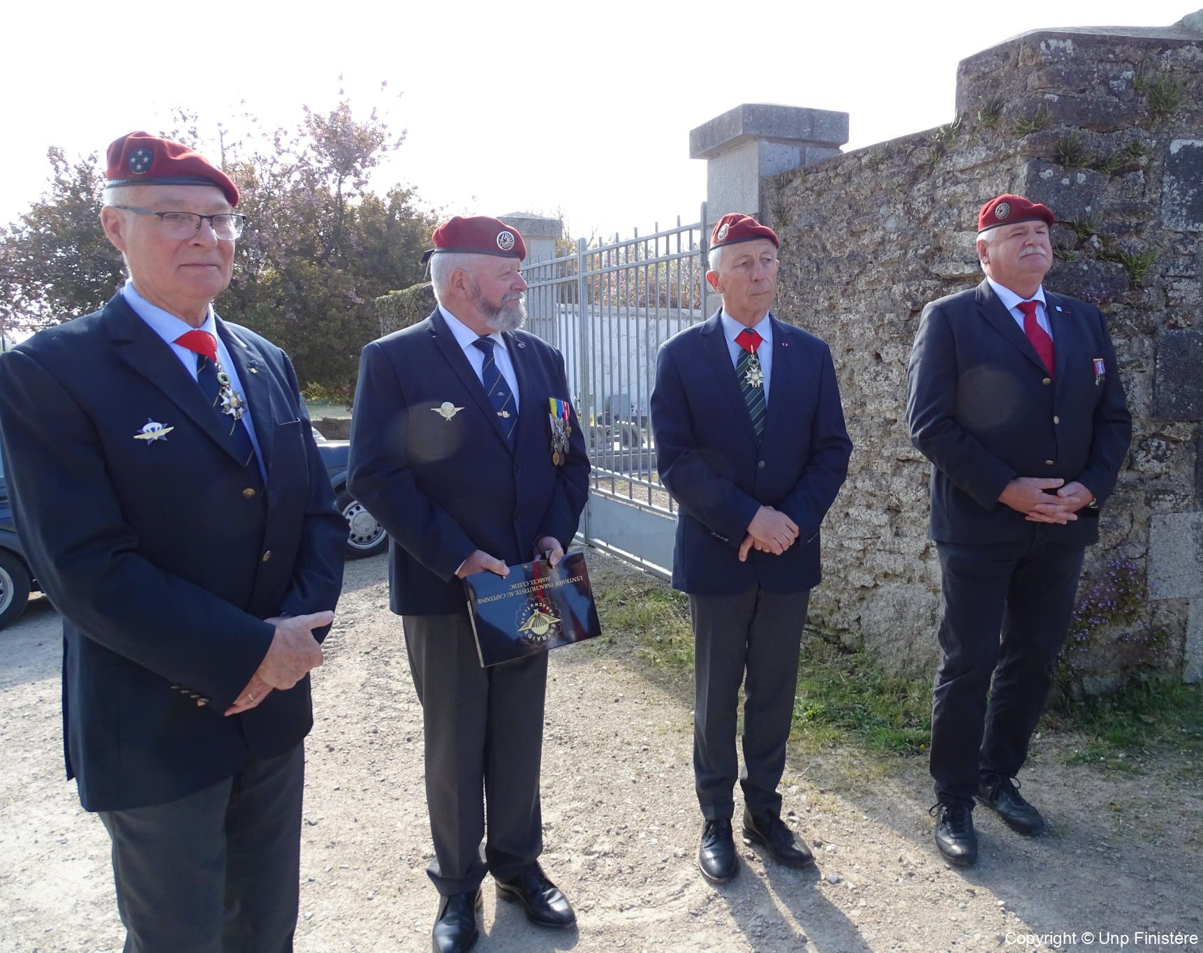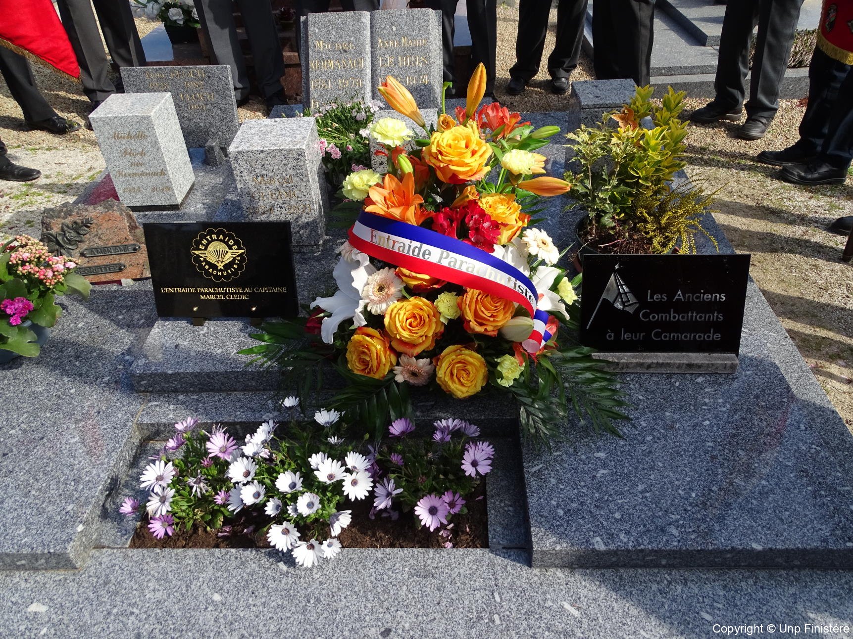 Rassemblés devant la tombe de notre ami Marcel, une vingtaine de participants ont assisté à cette cérémonie présidée par le général (er) Yves JACOPS. En présence du général (er) Jacques LECHEVALLIER, président de la FNAP, ancien Chef de Corps du 1er RCP, des membres de la famille, des représentants départementaux de l’Entraide Rémy FABRE et Jean-Marc DEBRUYNE, d’une délégation de la section UNP du Finistère et de sept porte-drapeaux. Une plaque et une gerbe ont été déposées sur la tombe par le président de l’Entraide. Les drapeaux se sont inclinés lors de la sonnerie aux « Morts » puis la Marseillaise a été entonnée par tous les participants. Pour la circonstance la Prière du Para a été chantée, cette cérémonie se termina par le chant » J’avais un camarade »