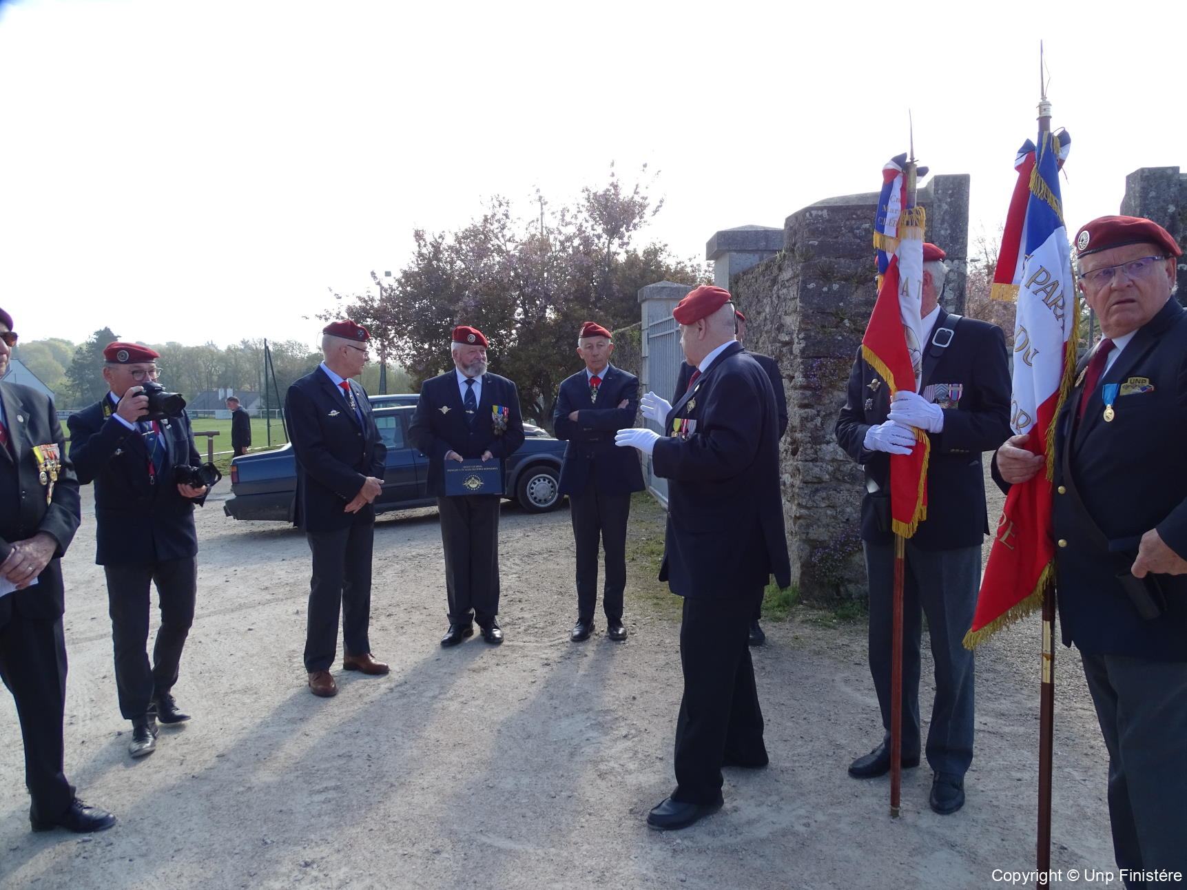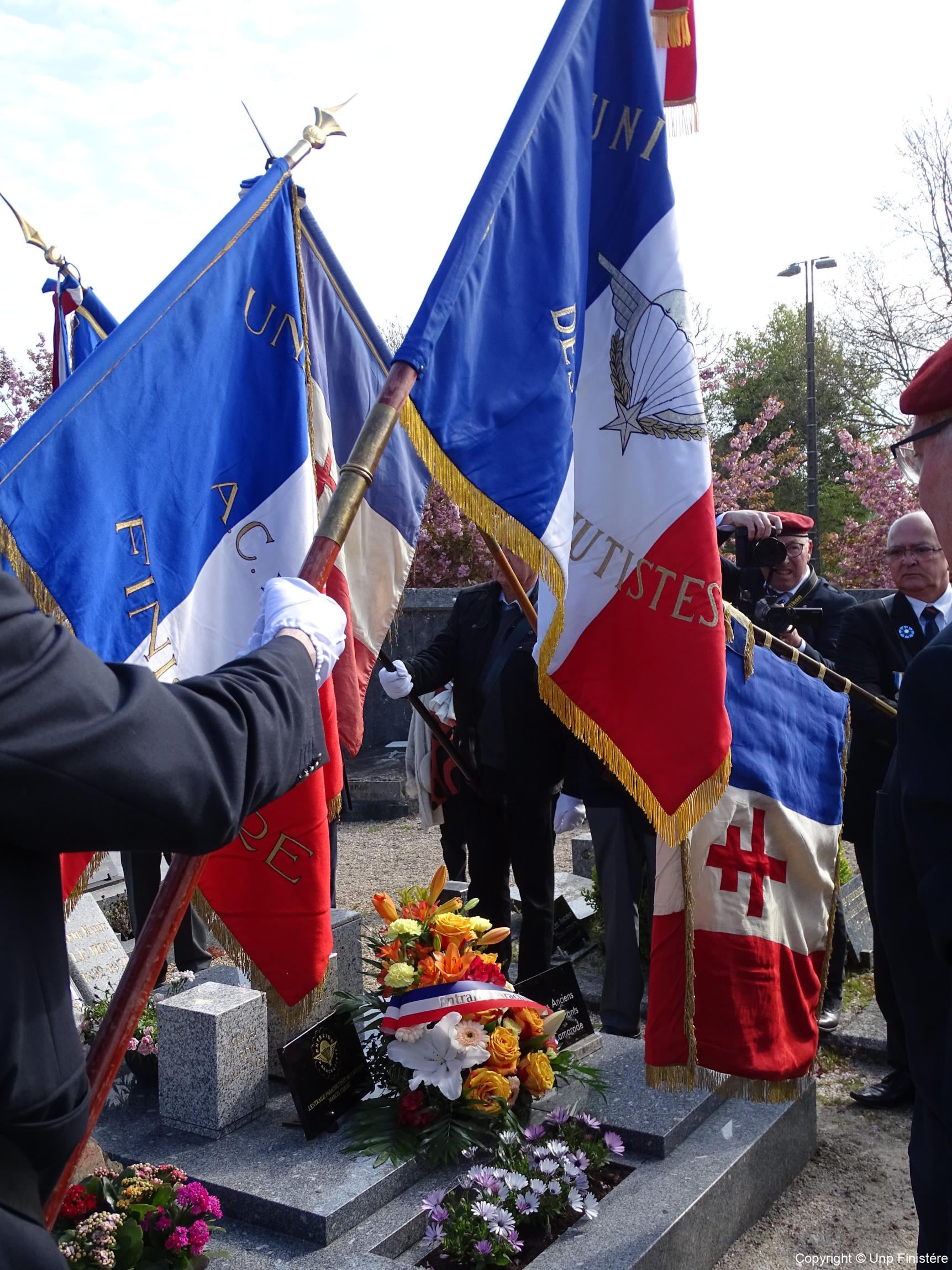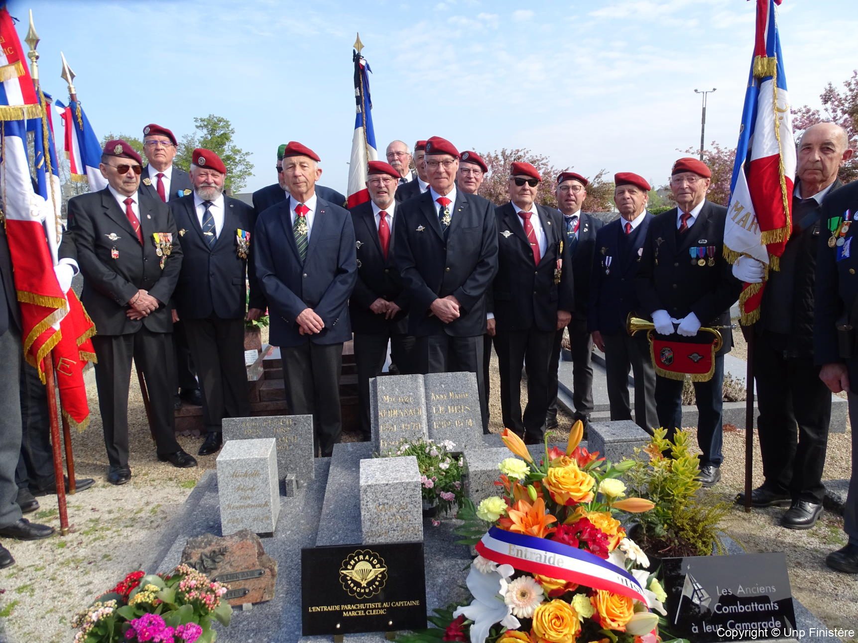 Rassemblés devant la tombe de notre ami Marcel, une vingtaine de participants ont assisté à cette cérémonie présidée par le général (er) Yves JACOPS. En présence du général (er) Jacques LECHEVALLIER, président de la FNAP, ancien Chef de Corps du 1er RCP, des membres de la famille, des représentants départementaux de l’Entraide Rémy FABRE et Jean-Marc DEBRUYNE, d’une délégation de la section UNP du Finistère et de sept porte-drapeaux. Une plaque et une gerbe ont été déposées sur la tombe par le président de l’Entraide. Les drapeaux se sont inclinés lors de la sonnerie aux « Morts » puis la Marseillaise a été entonnée par tous les participants. Pour la circonstance la Prière du Para a été chantée, cette cérémonie se termina par le chant » J’avais un camarade »