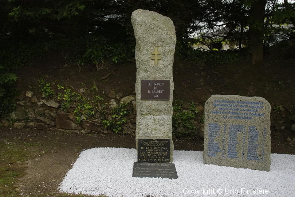 » Ce maquis de Saint Laurent comme bien d’autres , était composé de combattants que rien ne prédisposait à se battre ensemble contre un ennemi commun. Malgré leurs divergences politiques les hommes du maquis FTP de Jules , le Plestinais, du groupe FFI du docteur Le Janne mais encore les parachutistes  du colonel Château-Jobert et plus particulièrement dans le secteur qui nous intéresse les SAS  Spécial Air Service  de la 2ème compagnie du 3RCP commandée par le capitaine Sicaud, tous ont fait bloc contre l’envahisseur.