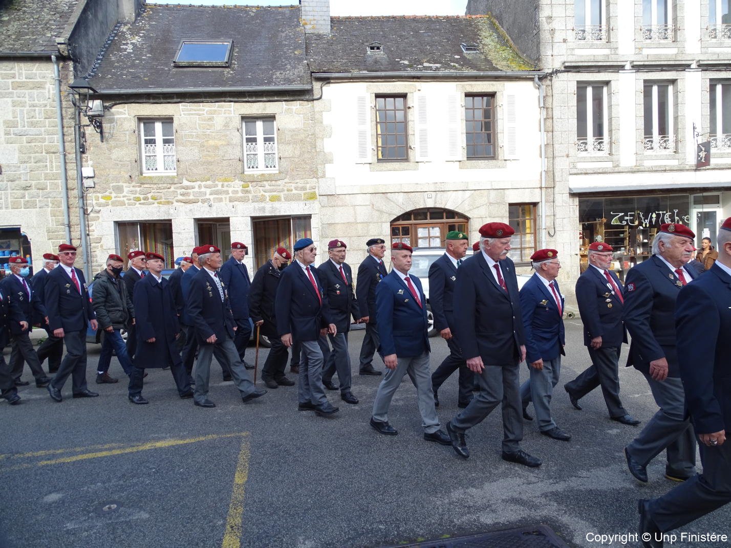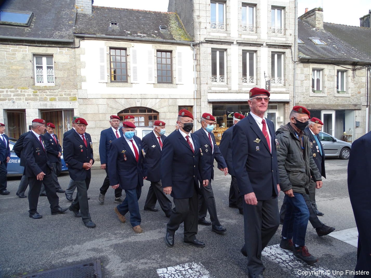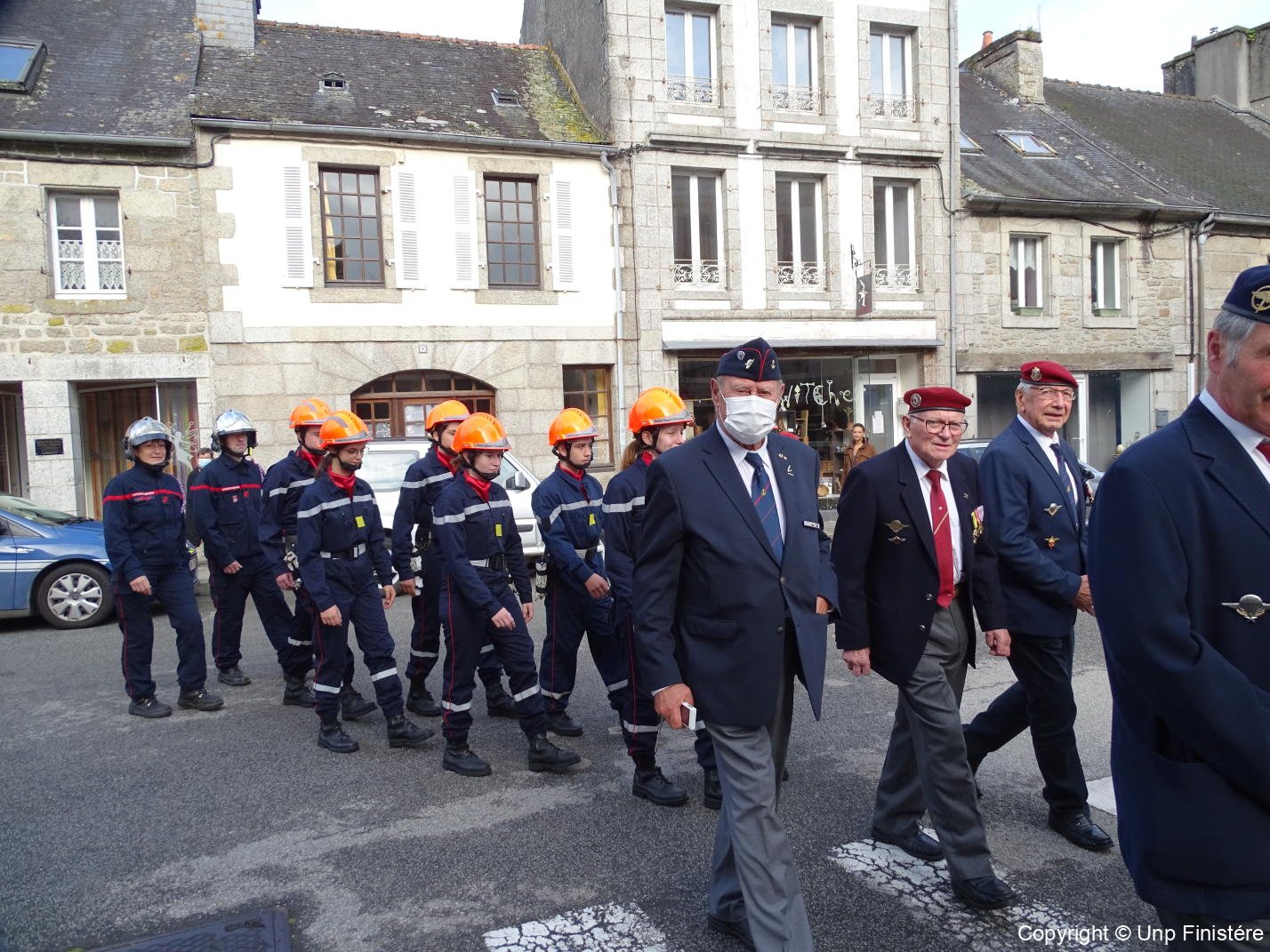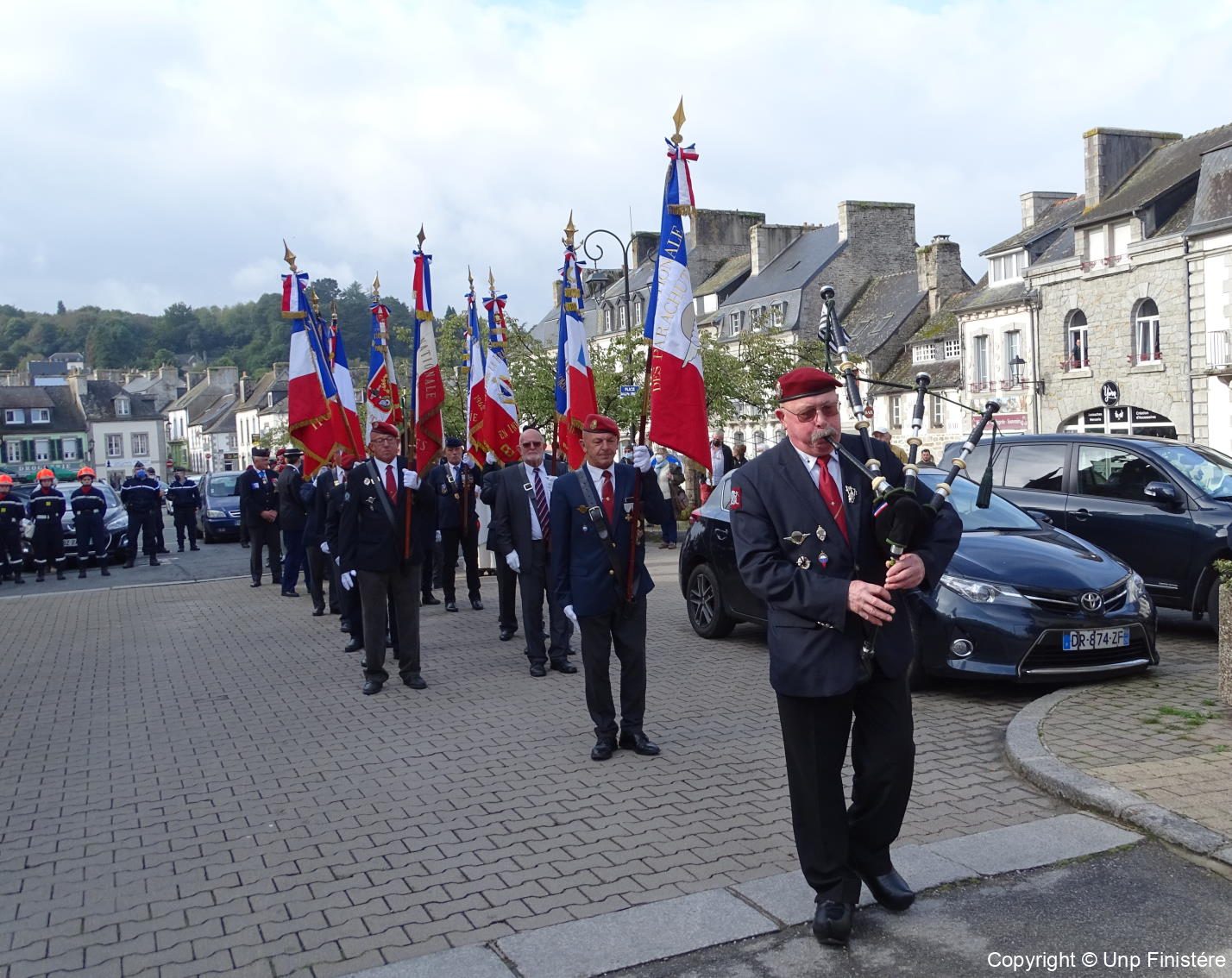 Sur le parvis attendent déjà quelques invités. Les quinze drapeaux présents se positionnent pour le défilé. Sous la houlette du maître la soixantaine de bérets présents s’apprêtent à rejoindre le monument aux Morts de la commune. Toutes les autorités se retrouvent en tête de cortège : maire, la colonelle commandant le groupement de gendarmerie du Finistère, l’adjoint du Délégué Militaire Départemental, le représentant du Commandant la communauté de brigades de gendarmerie de Carhaix-Huelgoat, et les nombreux présidents d’associations ayant répondu à notre invitation. Une première, l’absence (excusée) du Directeur de l’ONAC. Notre joueur de biniou, Jean-Noël fait vibrer son instrument, la totalité du cortège se met au diapason de la musique et rejoint la place en défilant où doit se dérouler la cérémonie. C’est avec grand plaisir que nous accueillons les jeunes sapeurs-pompiers de la commune.