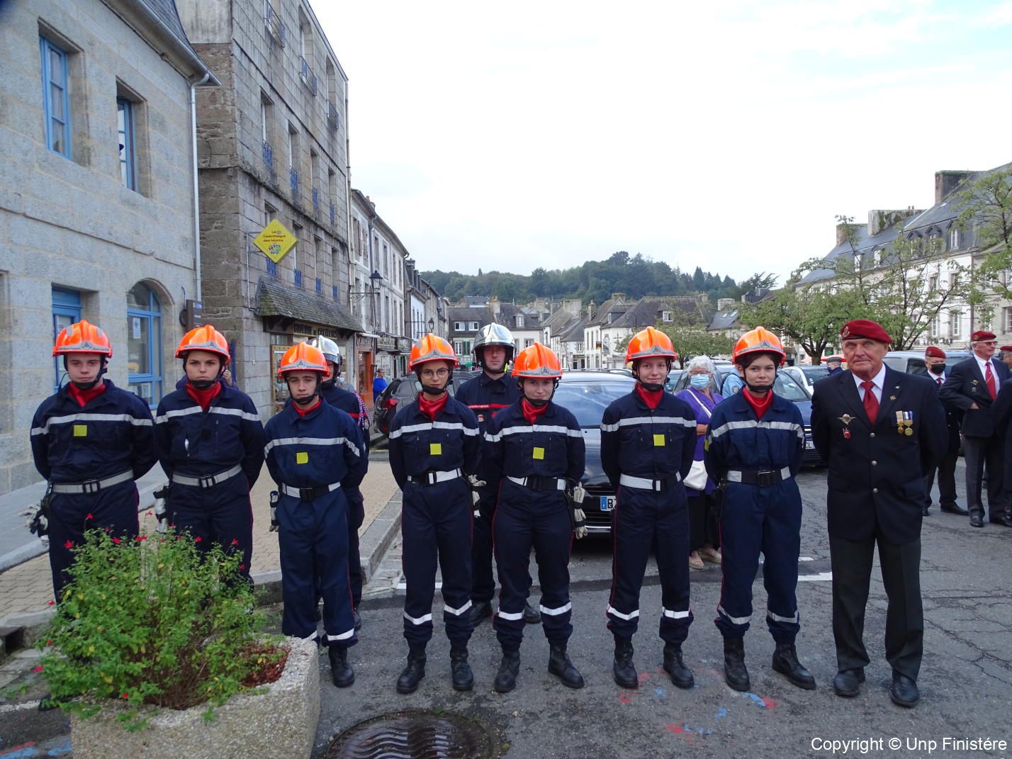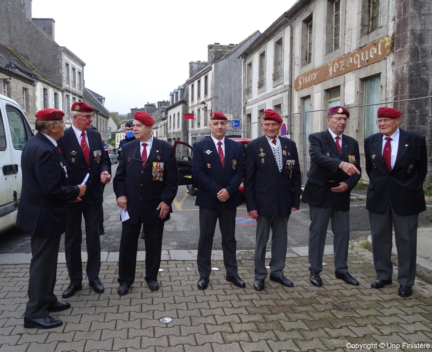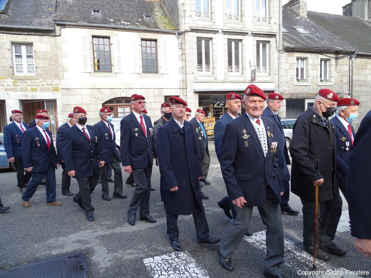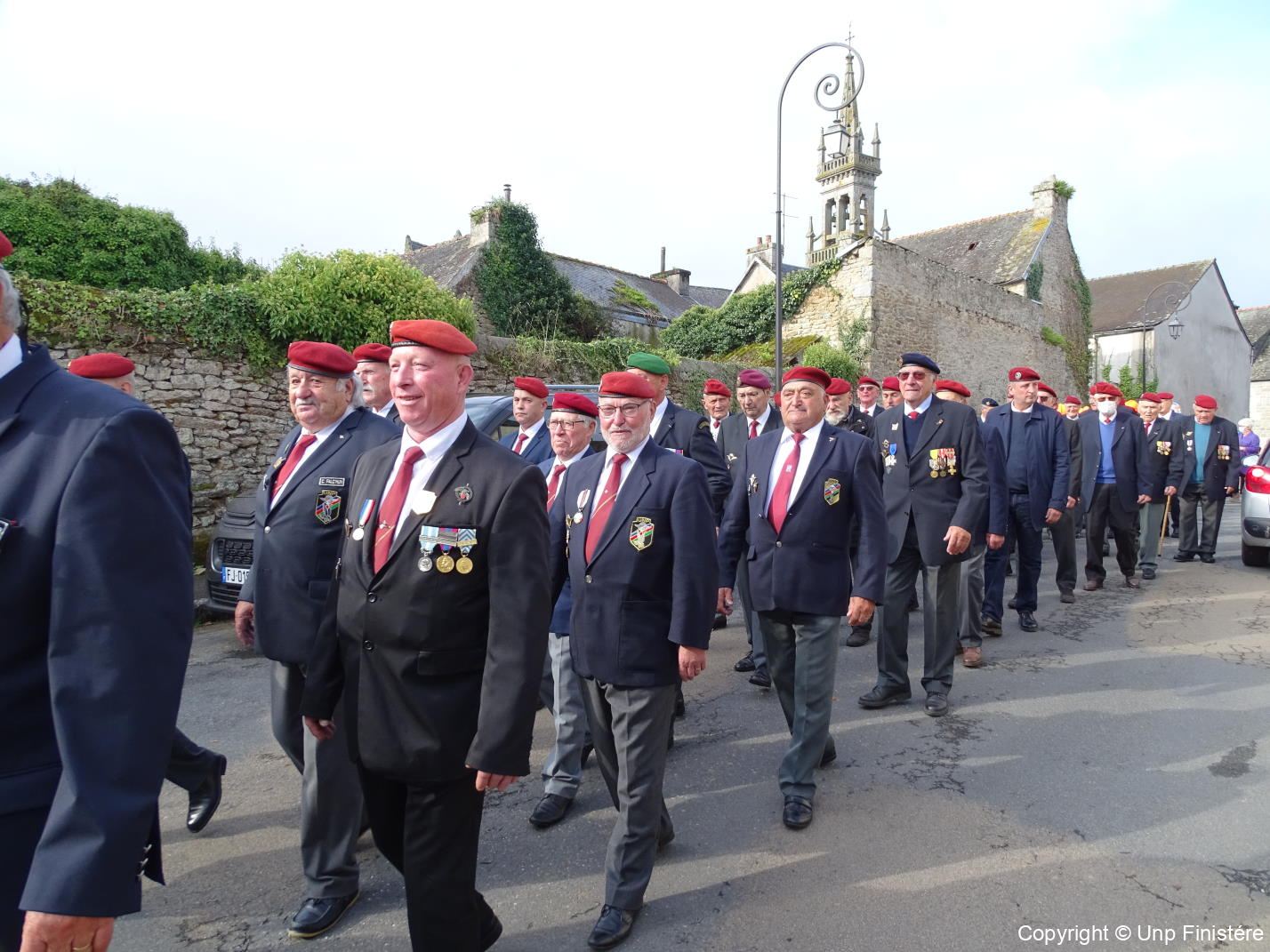 Sur le parvis attendent déjà quelques invités. Les quinze drapeaux présents se positionnent pour le défilé. Sous la houlette du maître la soixantaine de bérets présents s’apprêtent à rejoindre le monument aux Morts de la commune. Toutes les autorités se retrouvent en tête de cortège : maire, la colonelle commandant le groupement de gendarmerie du Finistère, l’adjoint du Délégué Militaire Départemental, le représentant du Commandant la communauté de brigades de gendarmerie de Carhaix-Huelgoat, et les nombreux présidents d’associations ayant répondu à notre invitation. Une première, l’absence (excusée) du Directeur de l’ONAC. Notre joueur de biniou, Jean-Noël fait vibrer son instrument, la totalité du cortège se met au diapason de la musique et rejoint la place en défilant où doit se dérouler la cérémonie. C’est avec grand plaisir que nous accueillons les jeunes sapeurs-pompiers de la commune.