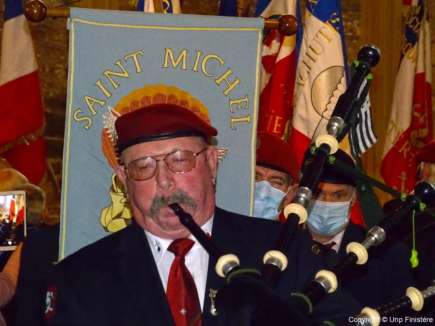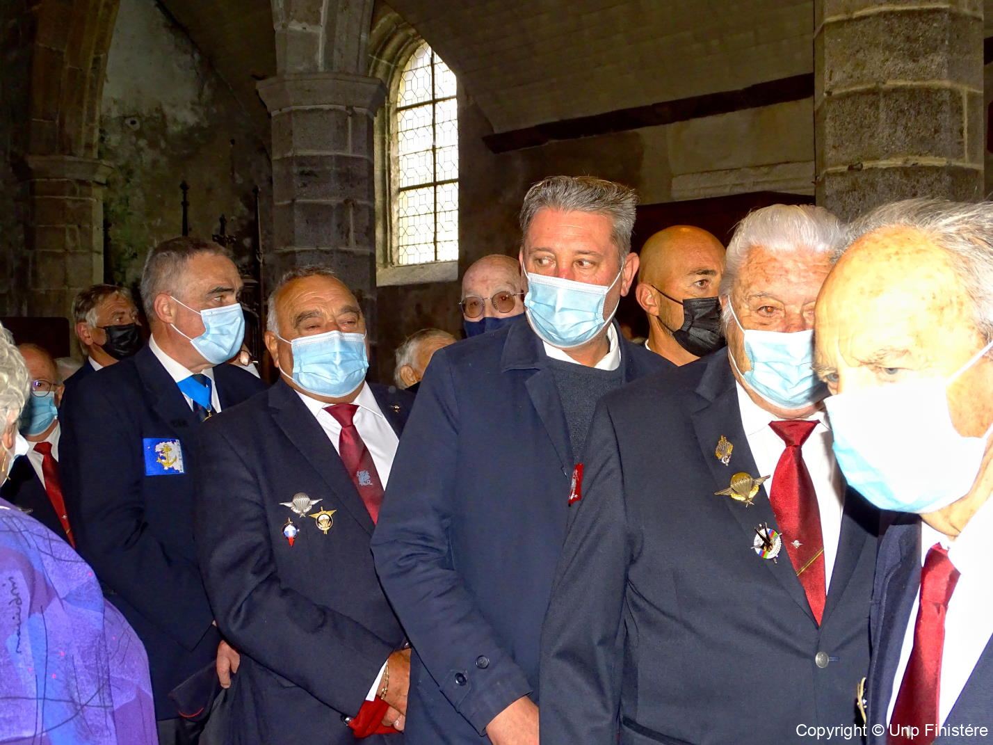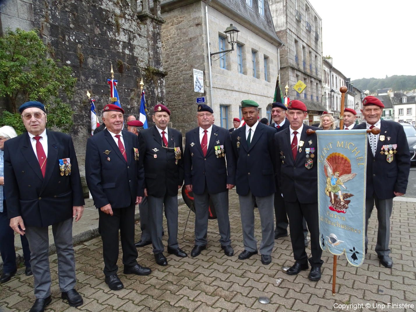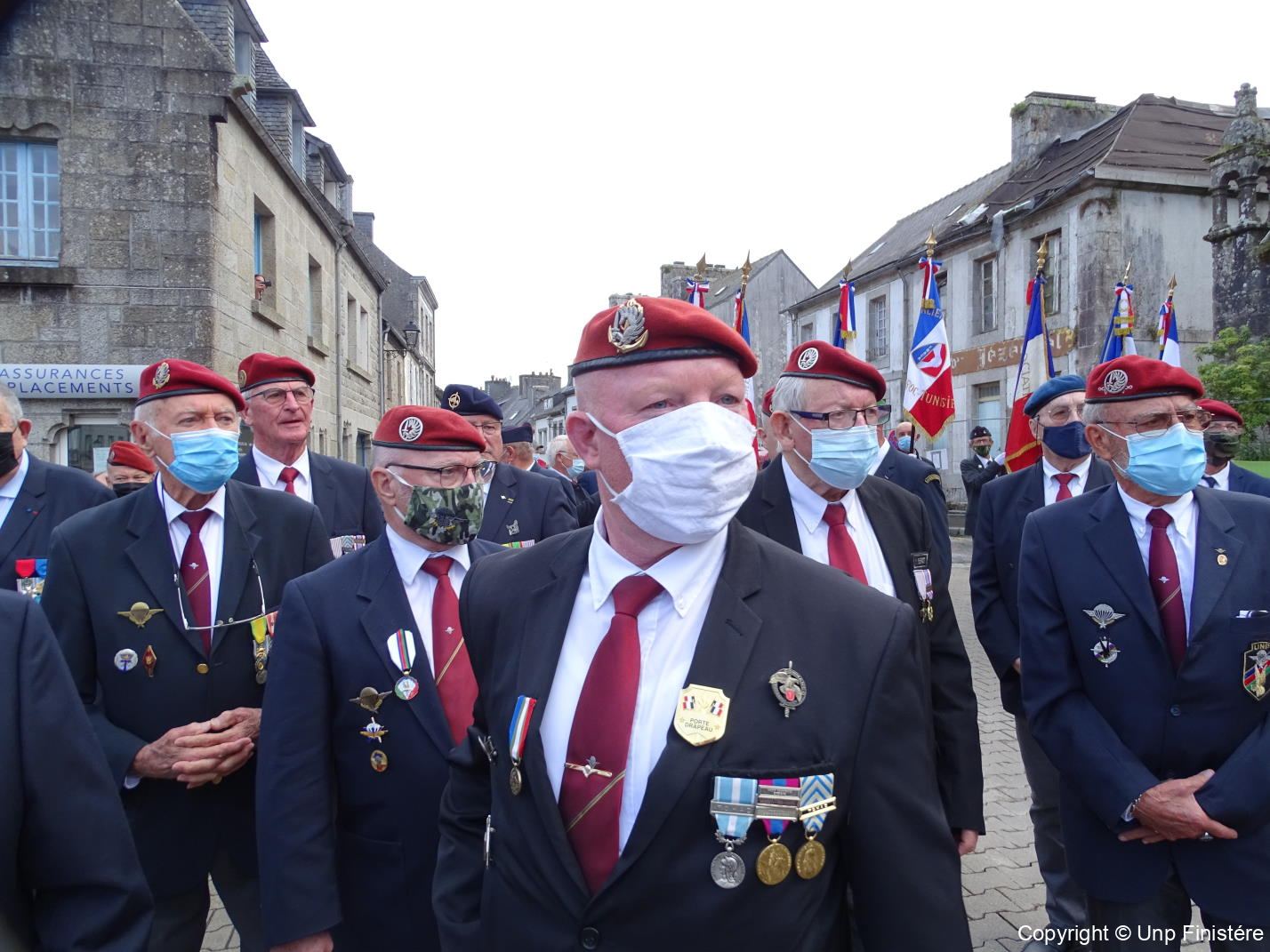Sur le parvis attendent déjà quelques invités. Les quinze drapeaux présents se positionnent pour le défilé. Sous la houlette du maître la soixantaine de bérets présents s’apprêtent à rejoindre le monument aux Morts de la commune. Toutes les autorités se retrouvent en tête de cortège : maire, la colonelle commandant le groupement de gendarmerie du Finistère, l’adjoint du Délégué Militaire Départemental, le représentant du Commandant la communauté de brigades de gendarmerie de Carhaix-Huelgoat, et les nombreux présidents d’associations ayant répondu à notre invitation. Une première, l’absence (excusée) du Directeur de l’ONAC. Notre joueur de biniou, Jean-Noël fait vibrer son instrument, la totalité du cortège se met au diapason de la musique et rejoint la place en défilant où doit se dérouler la cérémonie. C’est avec grand plaisir que nous accueillons les jeunes sapeurs-pompiers de la commune.
