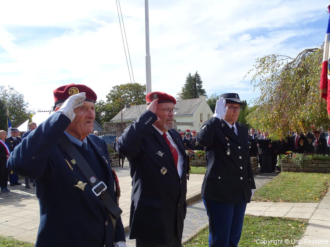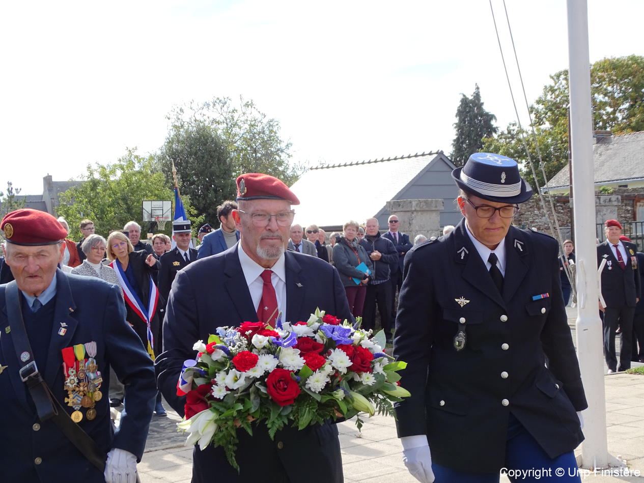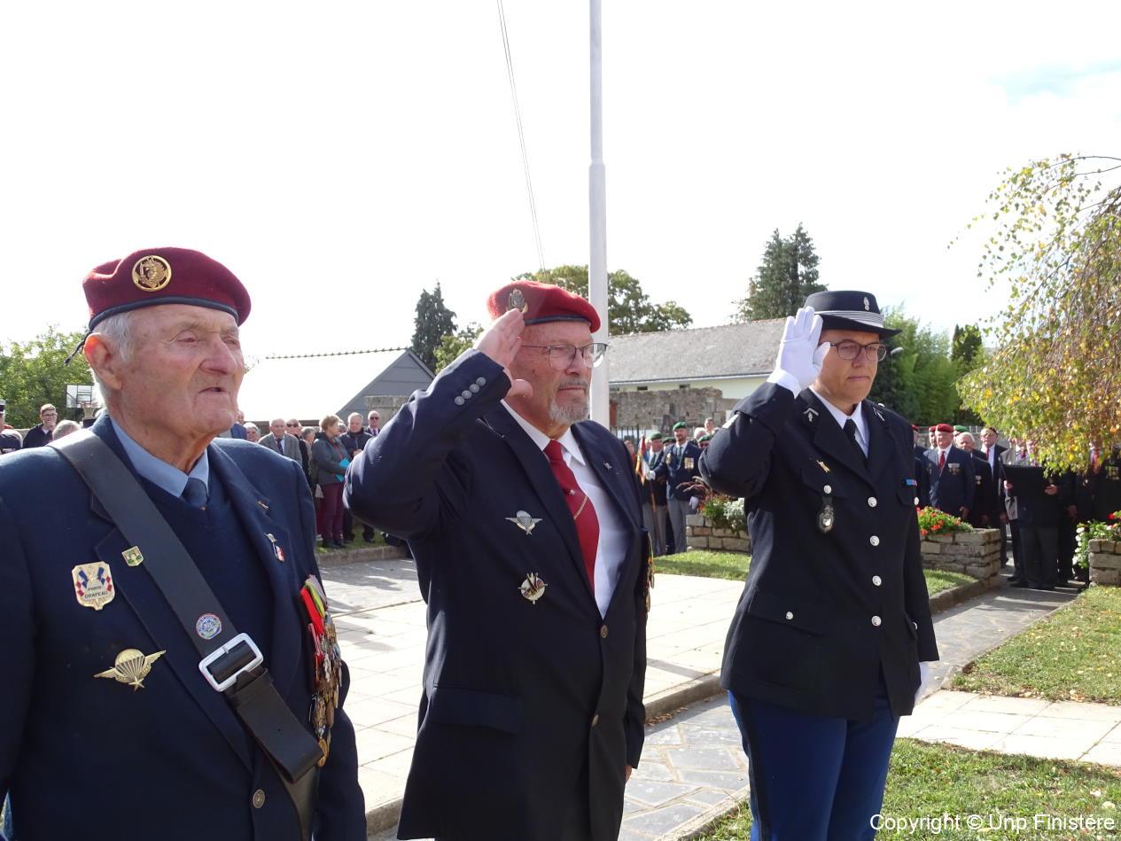 Une première gerbe est déposée par la Maire de la commune accompagné de deux jeunes filles, membres du conseil municipal des jeunes » une deuxième gerbe avec inscription » Union Nationale des Parachutistes » est déposée par le président de l’UNP29, accompagné par la colonelle TOURNANT et du parachutiste Roger OUADEC, dernier adhérent de la section ayant sauté à Dien Bien Phu avec le 1er RCP lors de l’opération » Castor »