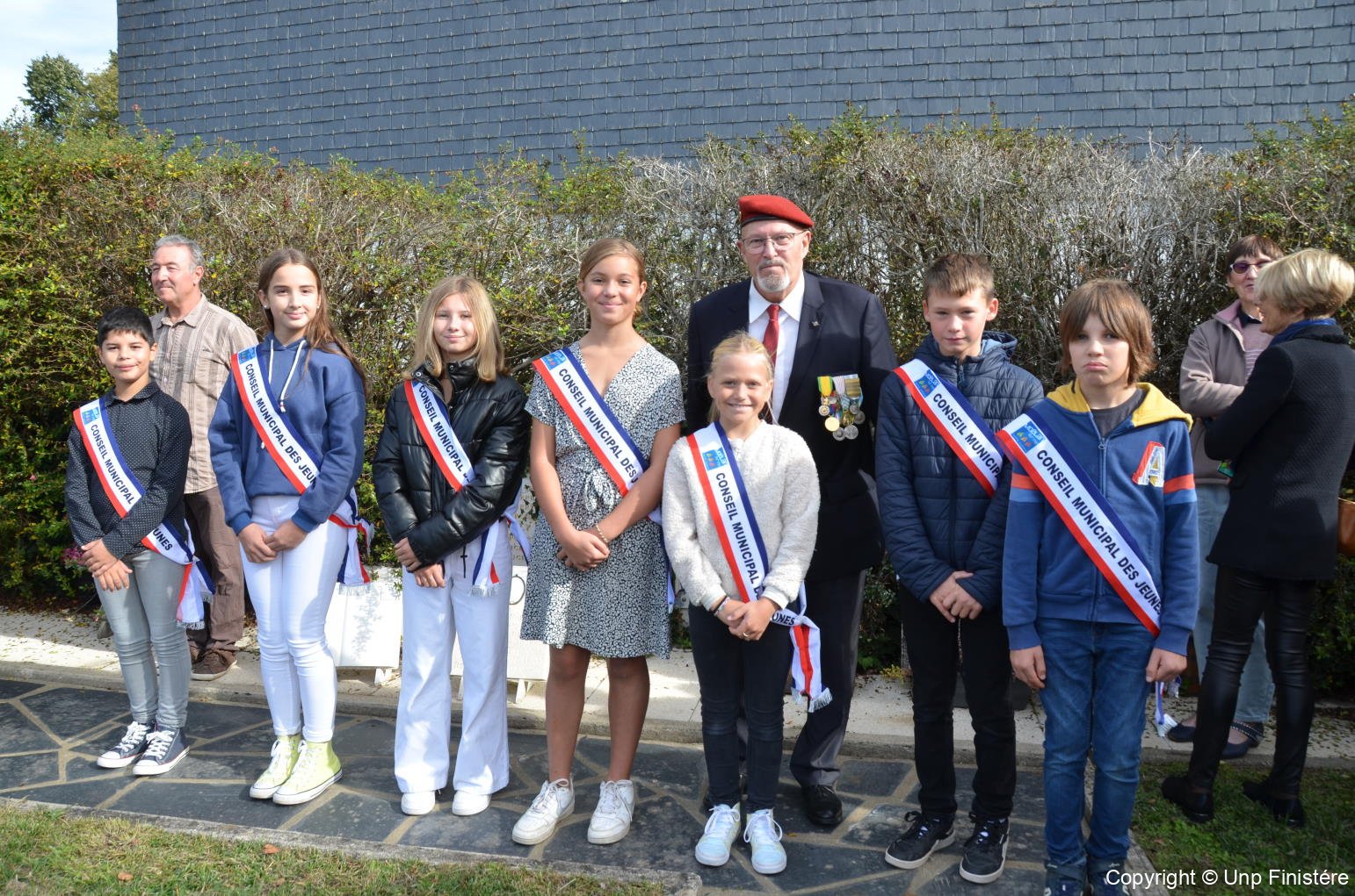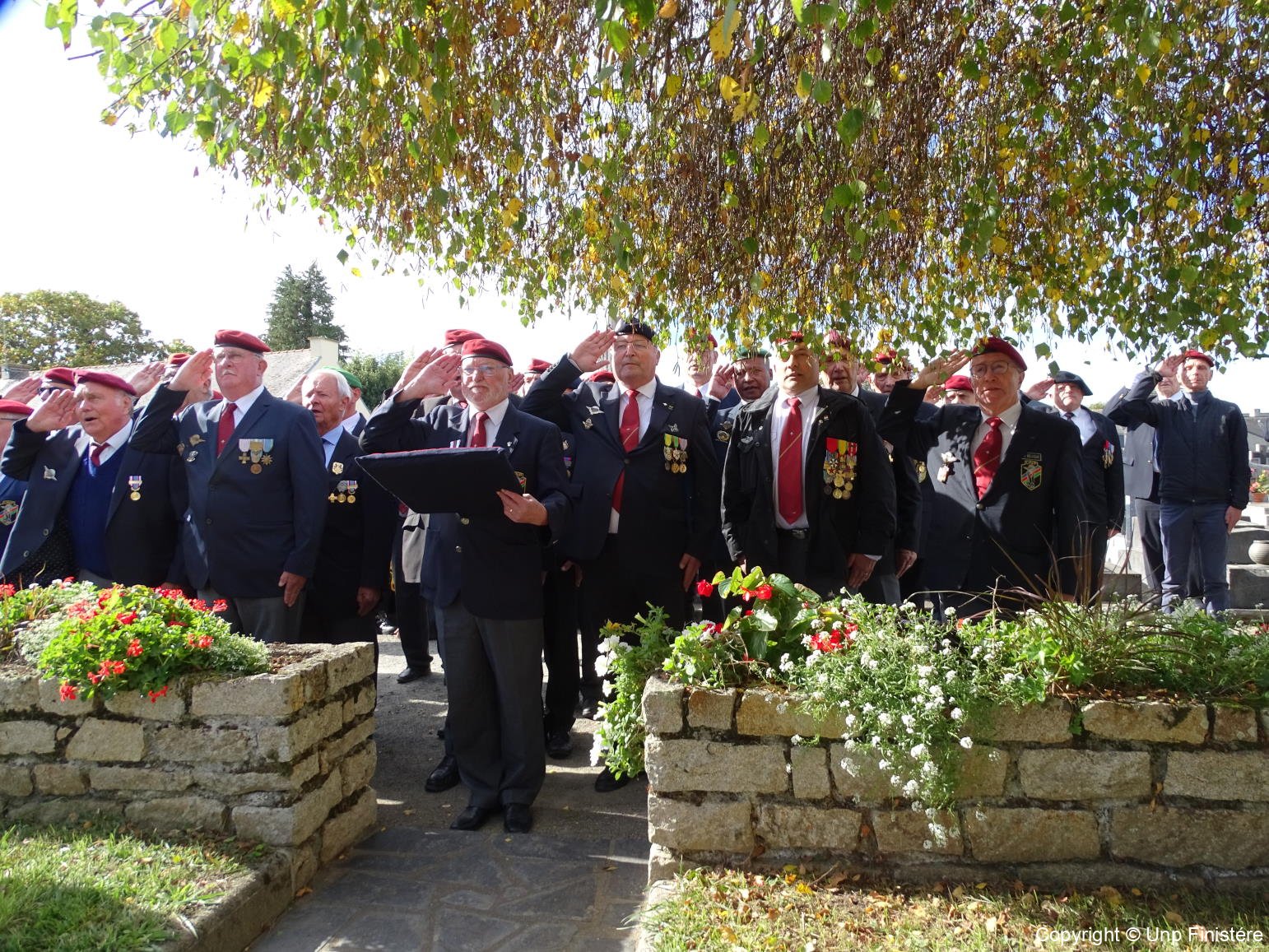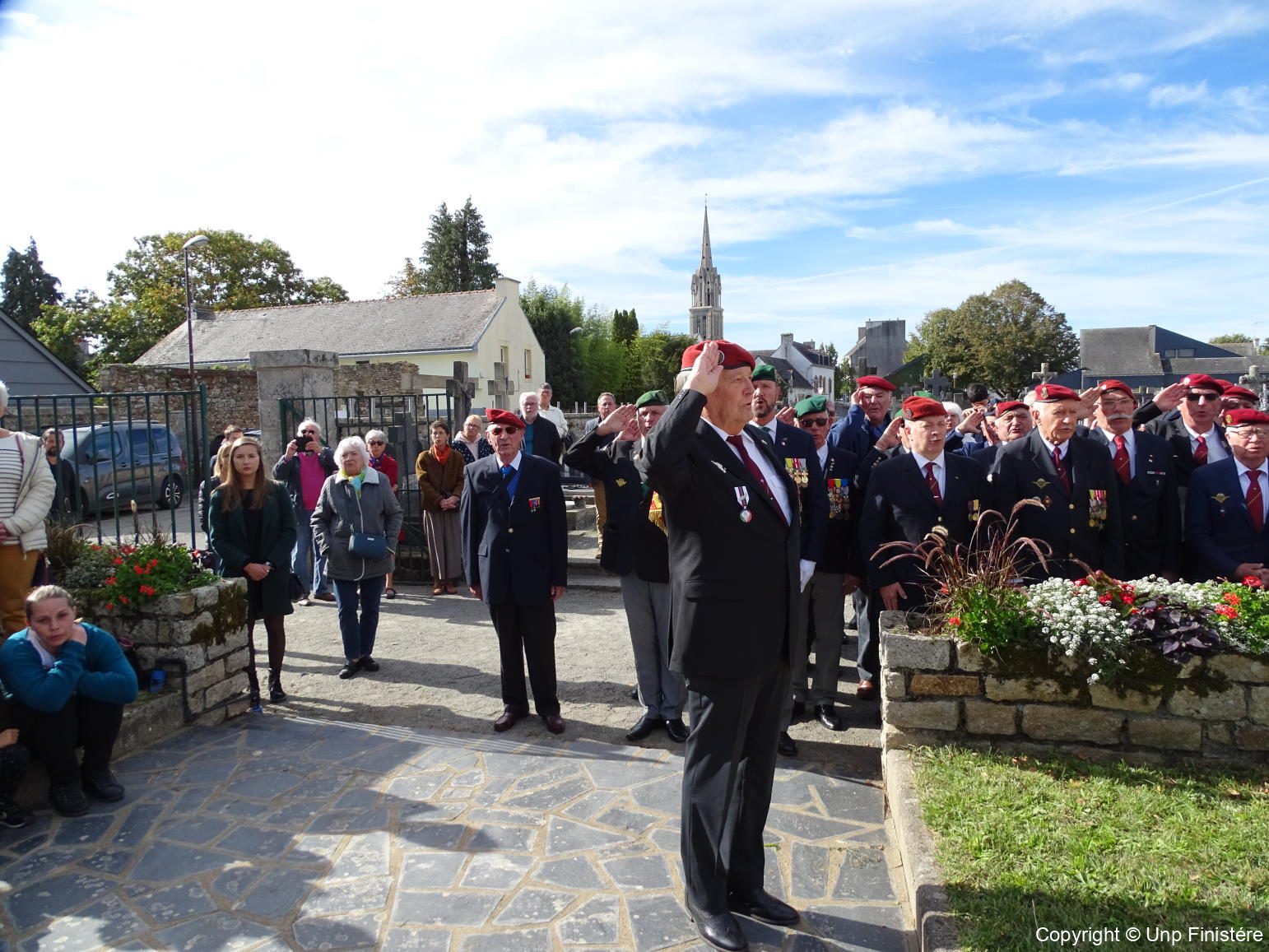 Une première gerbe est déposée par la Maire de la commune accompagné de deux jeunes filles, membres du conseil municipal des jeunes » une deuxième gerbe avec inscription » Union Nationale des Parachutistes » est déposée par le président de l’UNP29, accompagné par la colonelle TOURNANT et du parachutiste Roger OUADEC, dernier adhérent de la section ayant sauté à Dien Bien Phu avec le 1er RCP lors de l’opération » Castor »
