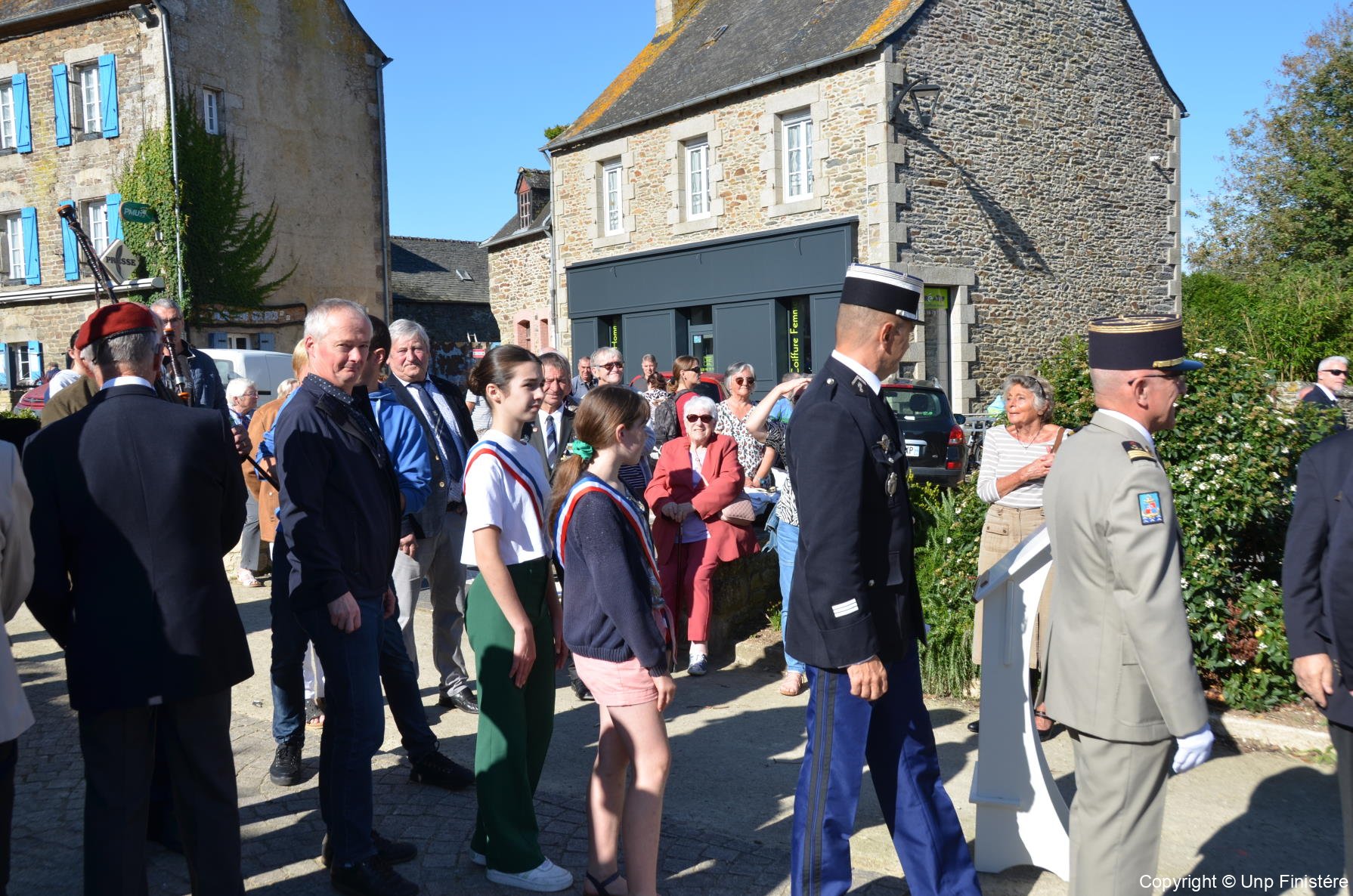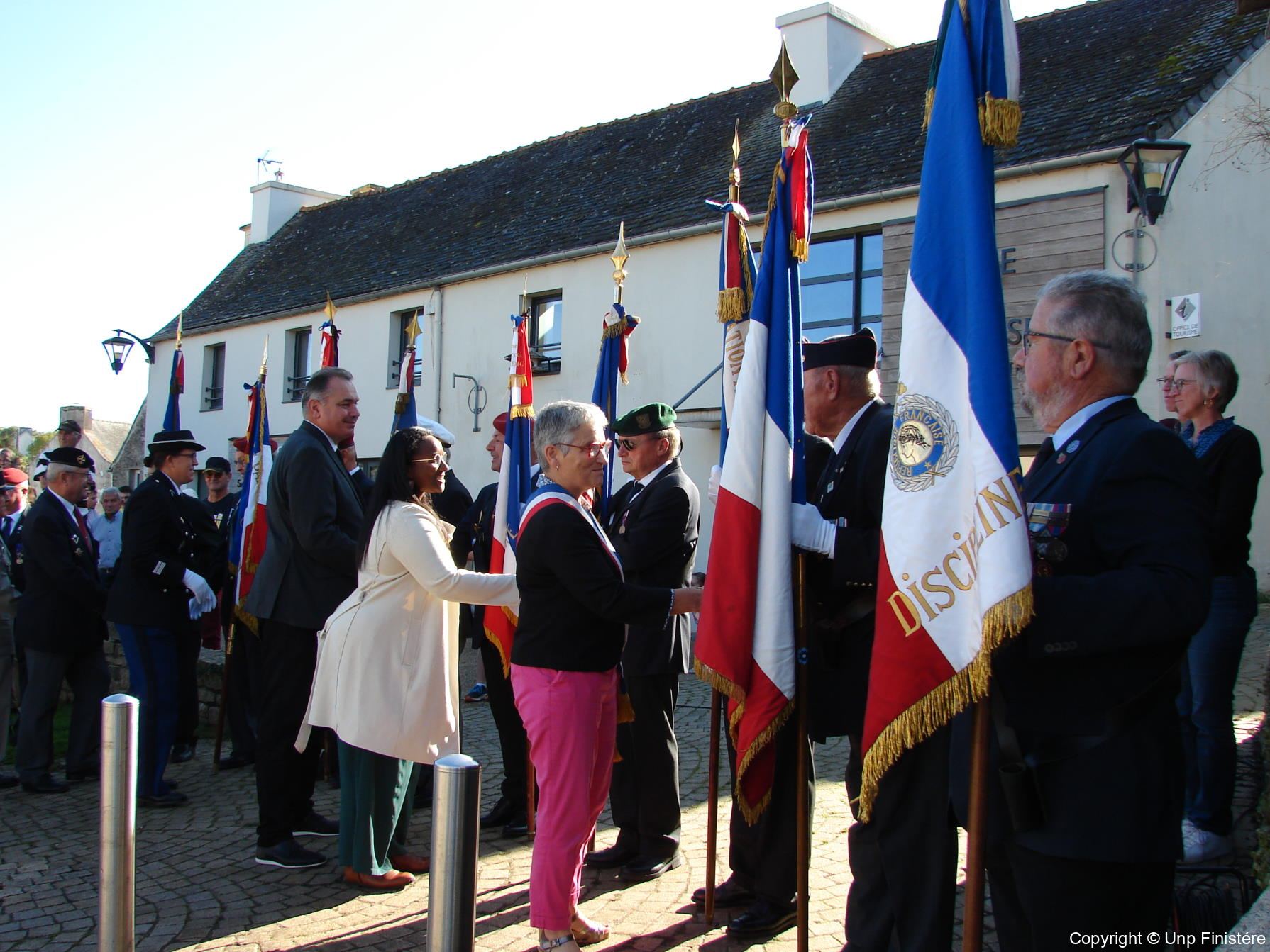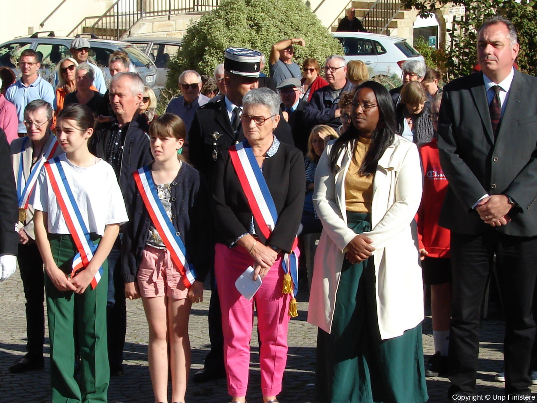 Le moment est venue d’honorer les noms des Morts inscrits en nombre sur le monument. Une première gerbe est déposée au nom de l’UNP29et UNC29. Le président départemental de l’UNP et le chef de section de l’UNC local dépose une gerbe au pied du monument , ils sont accompagnés, par la colonelle Charlotte Tournant, commandant le Groupement de Gendarmerie du Finistère et le général ® Henri Salaün, membre de la section UNP29.