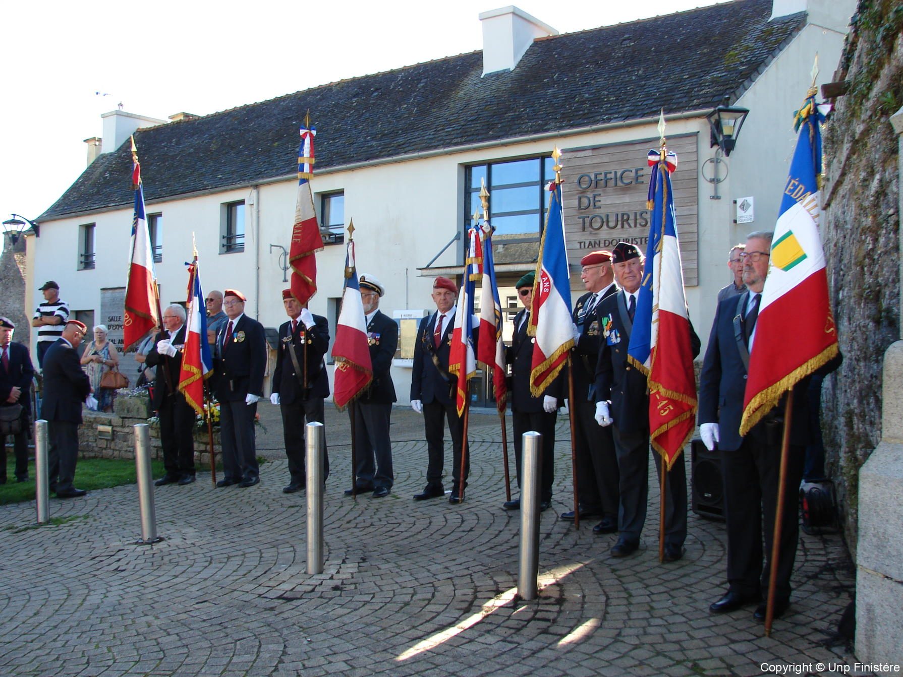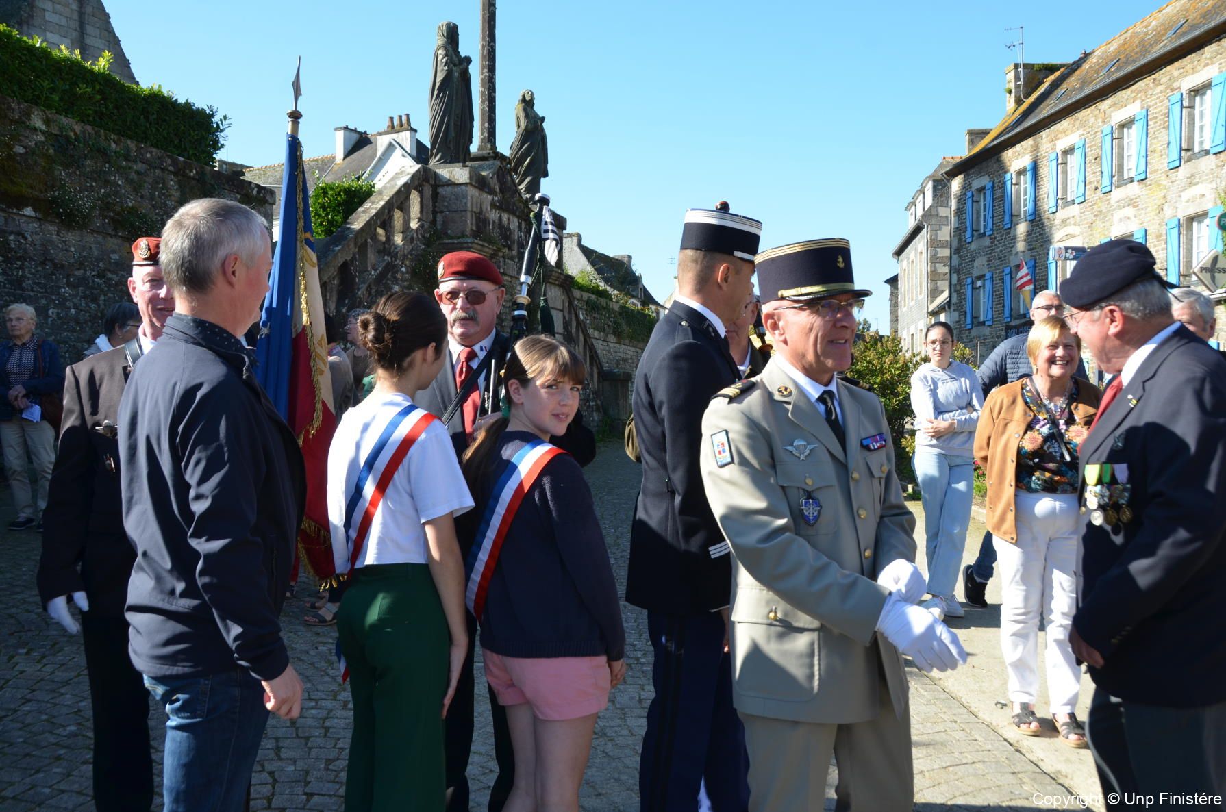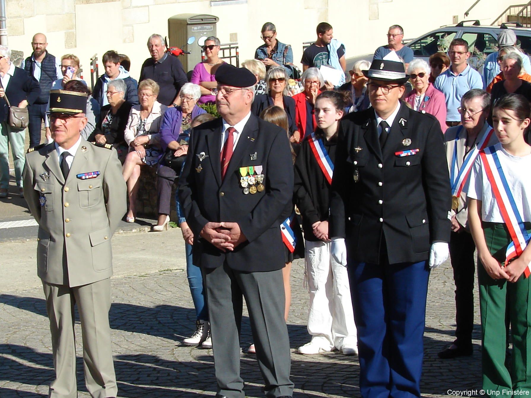 Le moment est venue d’honorer les noms des Morts inscrits en nombre sur le monument. Une première gerbe est déposée au nom de l’UNP29et UNC29. Le président départemental de l’UNP et le chef de section de l’UNC local dépose une gerbe au pied du monument , ils sont accompagnés, par la colonelle Charlotte Tournant, commandant le Groupement de Gendarmerie du Finistère et le général ® Henri Salaün, membre de la section UNP29.