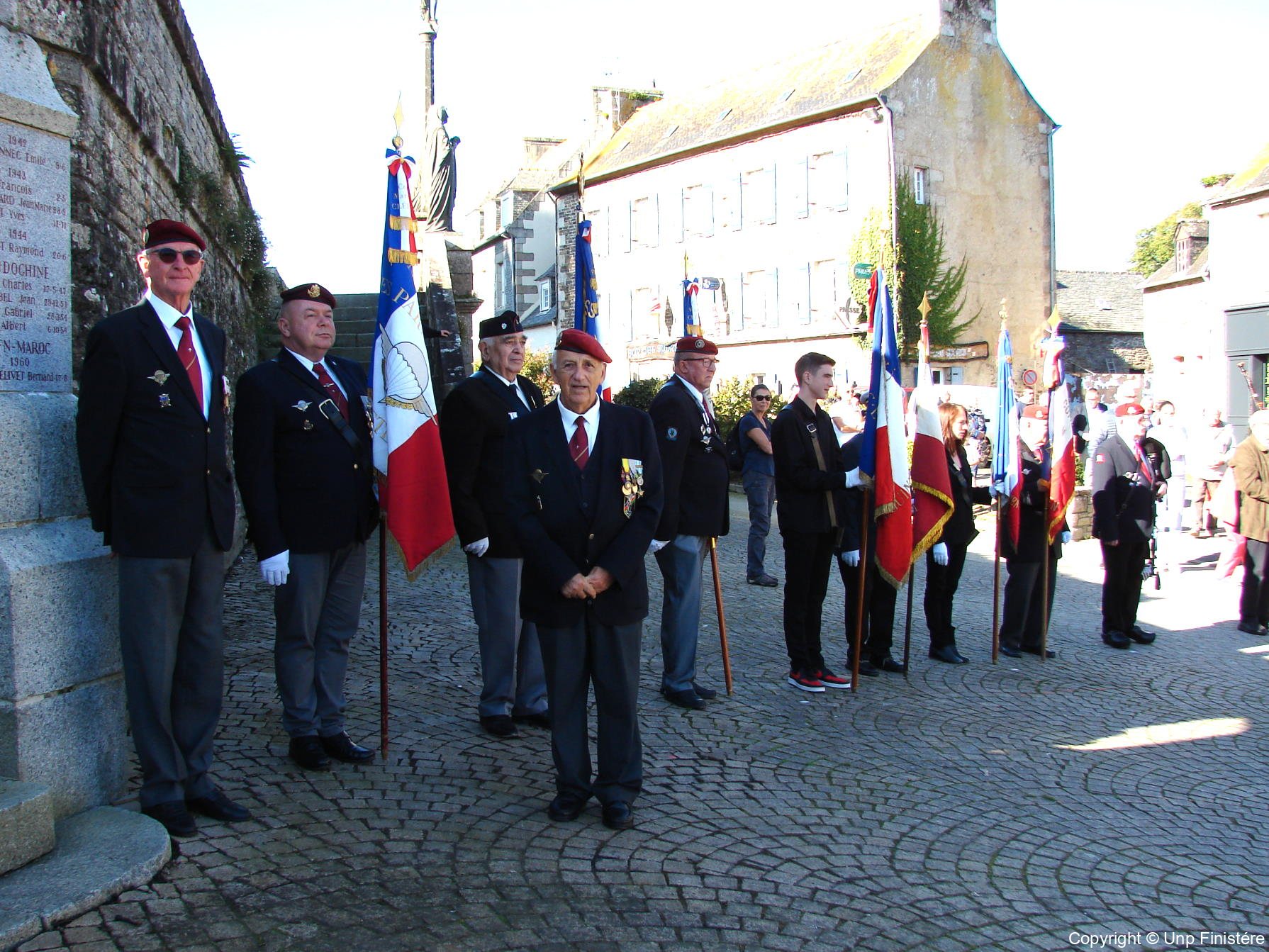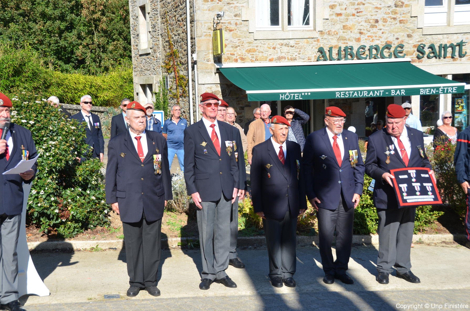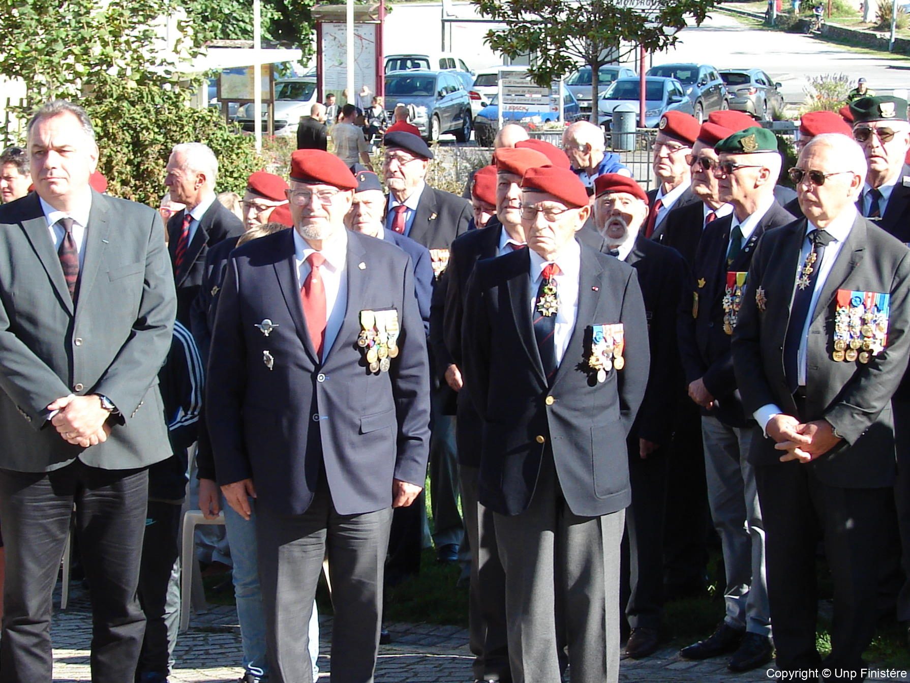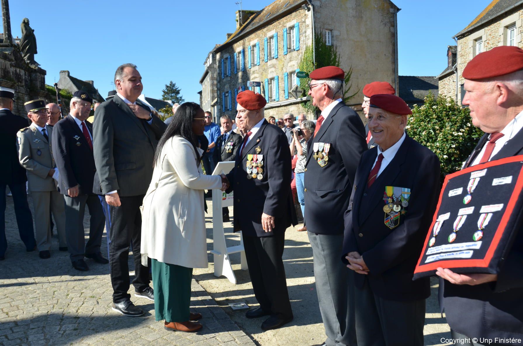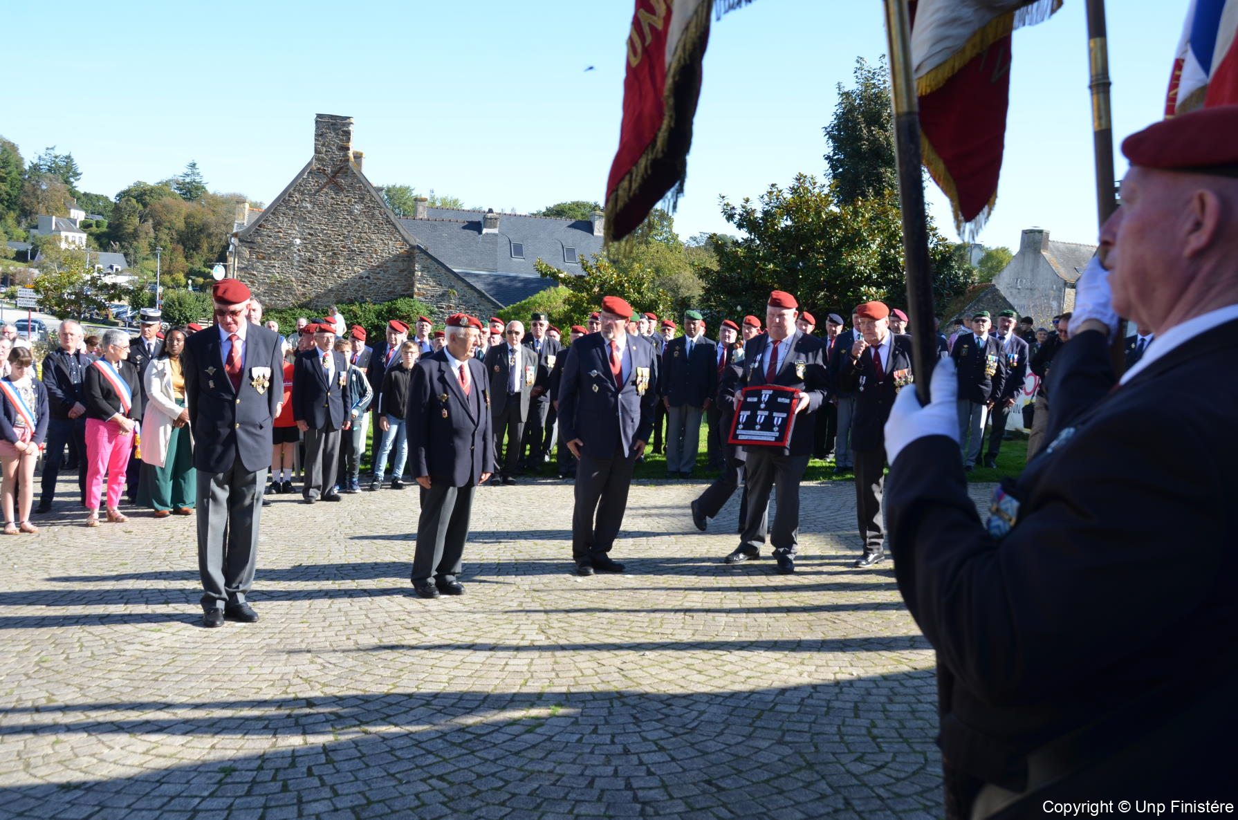 Toujours sous la houlette de notre Christian, à peine sortie de l’église, il se charge de mettre en configuration, le dispositif pour la cérémonie devant le monument aux Morts. Très rapidement chacun trouve sa place. Madame Solange CREIGNOU, maire de la commune , adresse un message de bienvenue et sa fierté, d’avoir dans sa ville un aussi important rassemblement devant le monument aux Morts. A son tour le président de la section UNP du Finistère porte à notre connaissance, le message du président national de l’Union Nationale des Parachutistes, le général Vincent Guionie.