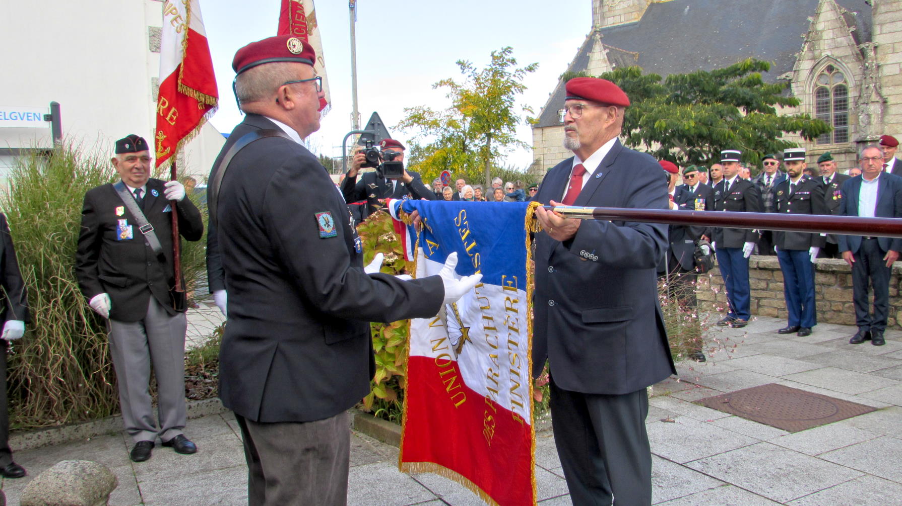Le cérémonial de la remise du nouveau drapeau est parfaitement respecté. Drapeau roulé le Directeur de l’ONaCVG transmet l’étendard à notre président. Effectuant un demi-tour il se retrouve face à Yvon BODILIS, porte-drapeau, et lui adresse ce message » Nous vous confions ce drapeau, il est le symbole de la Patrie, vous le porterez et conserverez dans l’honneur et la dignité » A l’issue chacun rejoint son emplacement.