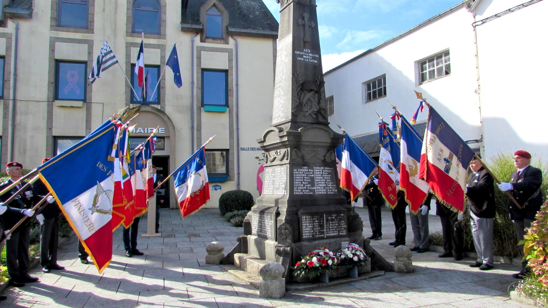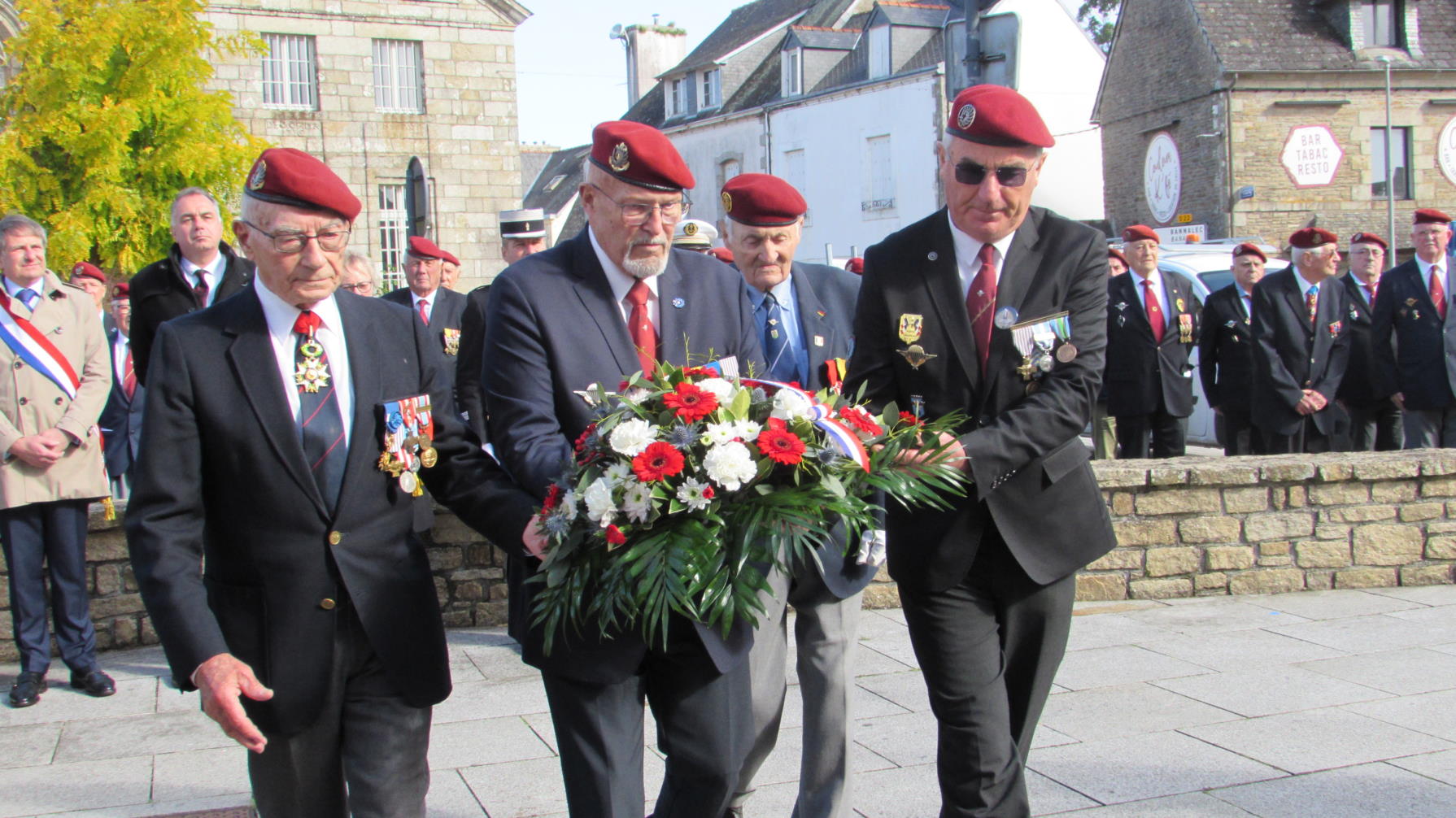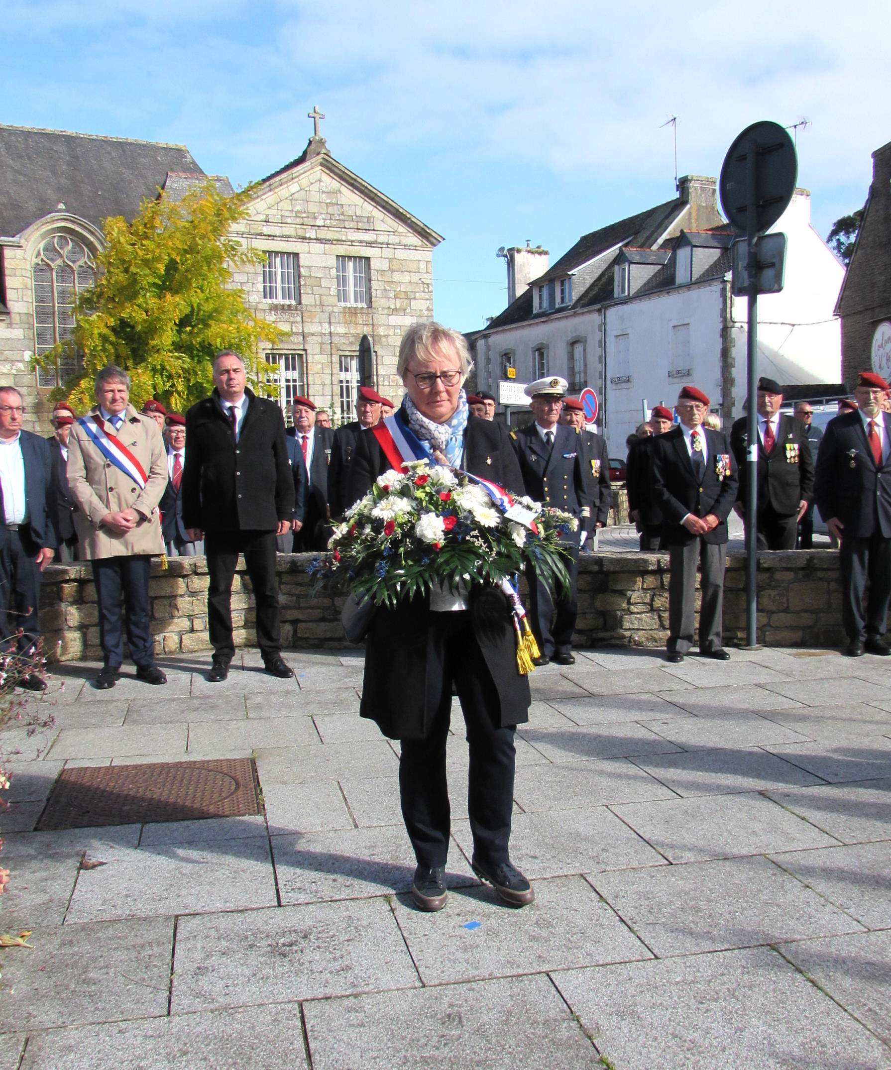 Une première gerbe est déposée par le président de l’UNP29, accompagné du général SALAÜN, de notre grand ancien Roger OUADEC ayant participé à l’opération Castor à Dien Bien Phu, et de Jean-Luc DOREAU président des Anciens Combattants de la commune.