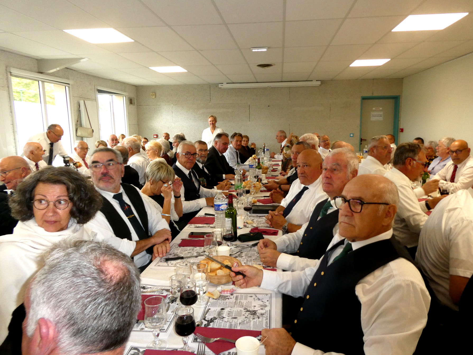 13h15 le stade se vide, les personnes inscrites au repas de cohésion sont invitées à rejoindre la salle Louise Ebrel. Salle comble, cent quarante personnes s’installent dans cette salle mise à notre disposition.