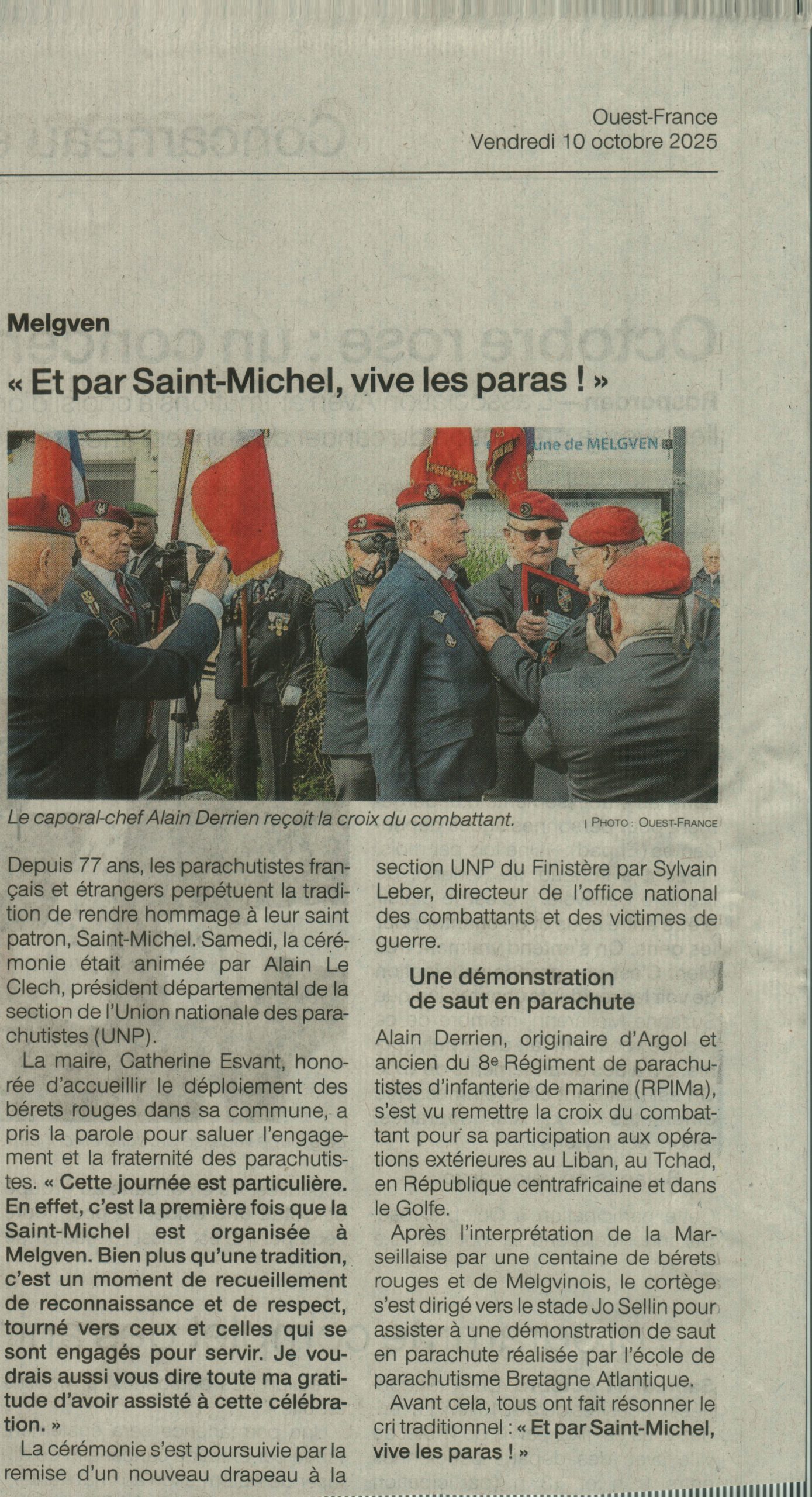 Le dimanche 05 octobre 2025, les adhérents de l’Union Nationale des Parachutistes, section capitaine Marcel Clédic, s’étaient donné rendez-vous à Melgven, commune située à proximité de Concarneau, pour célébrer la Saint-Michel.