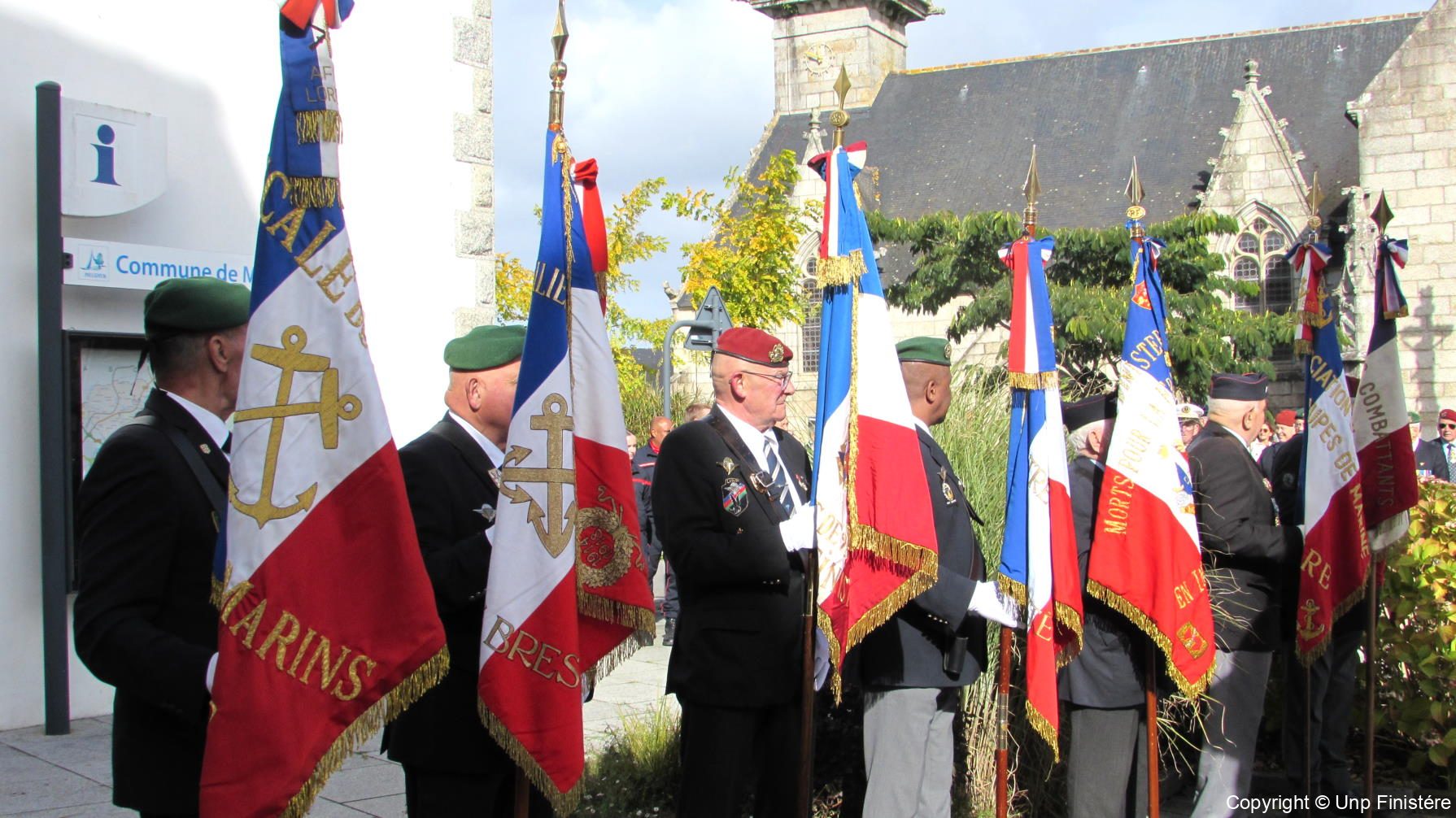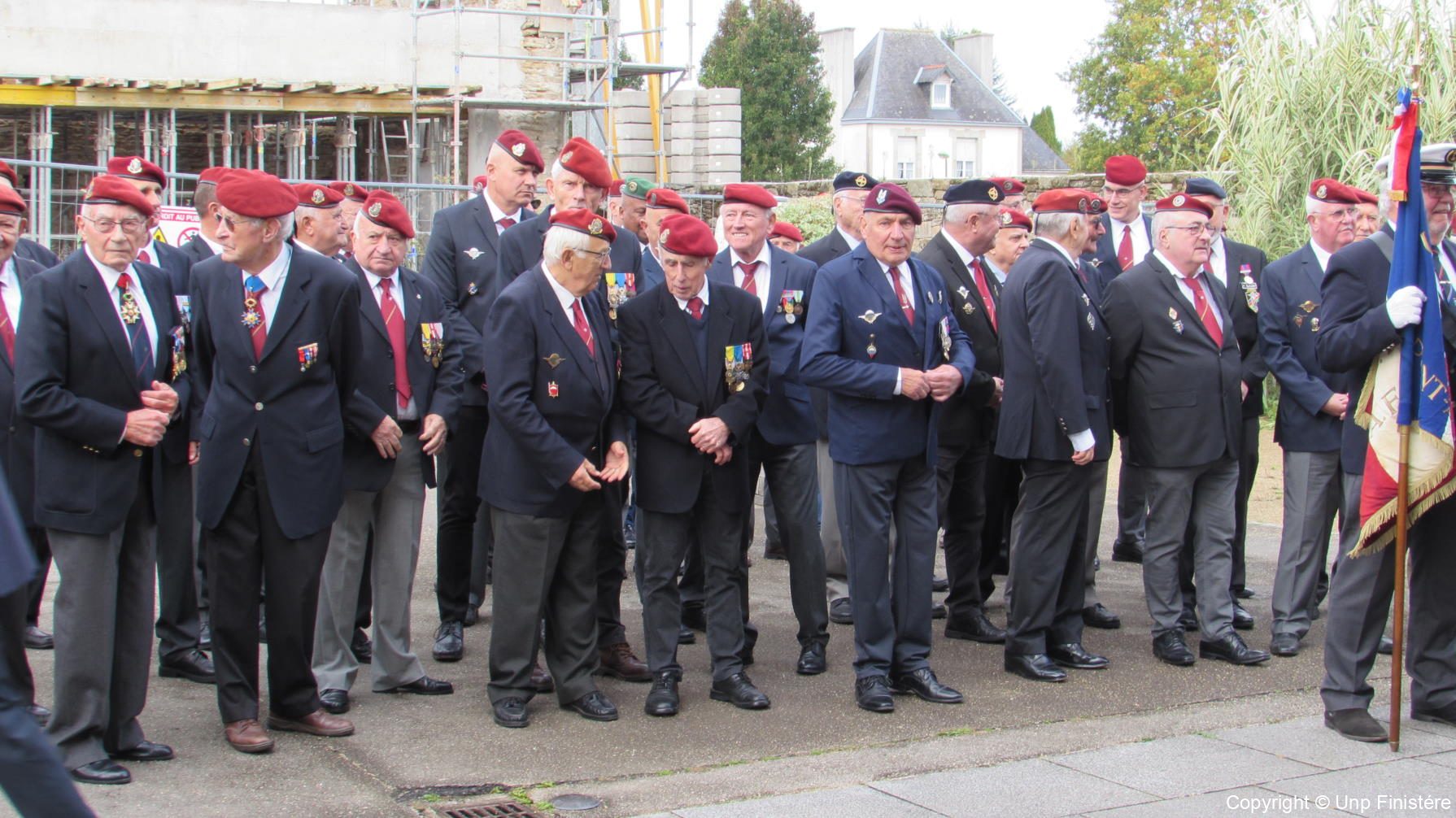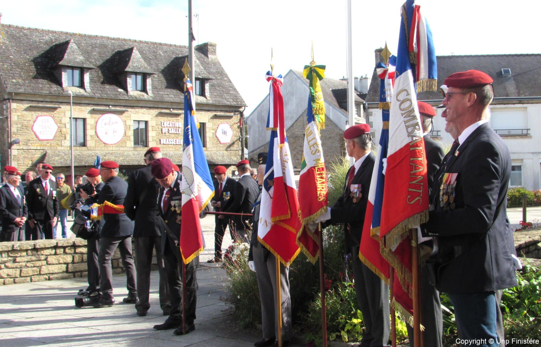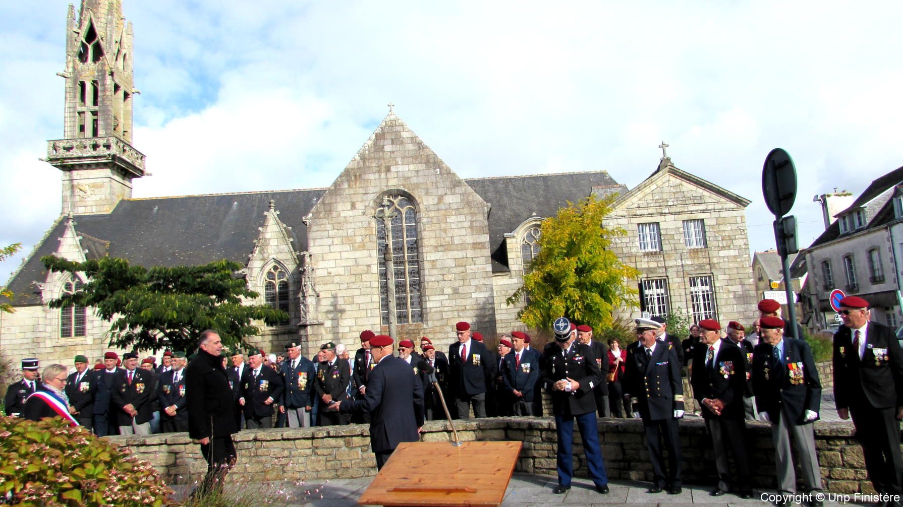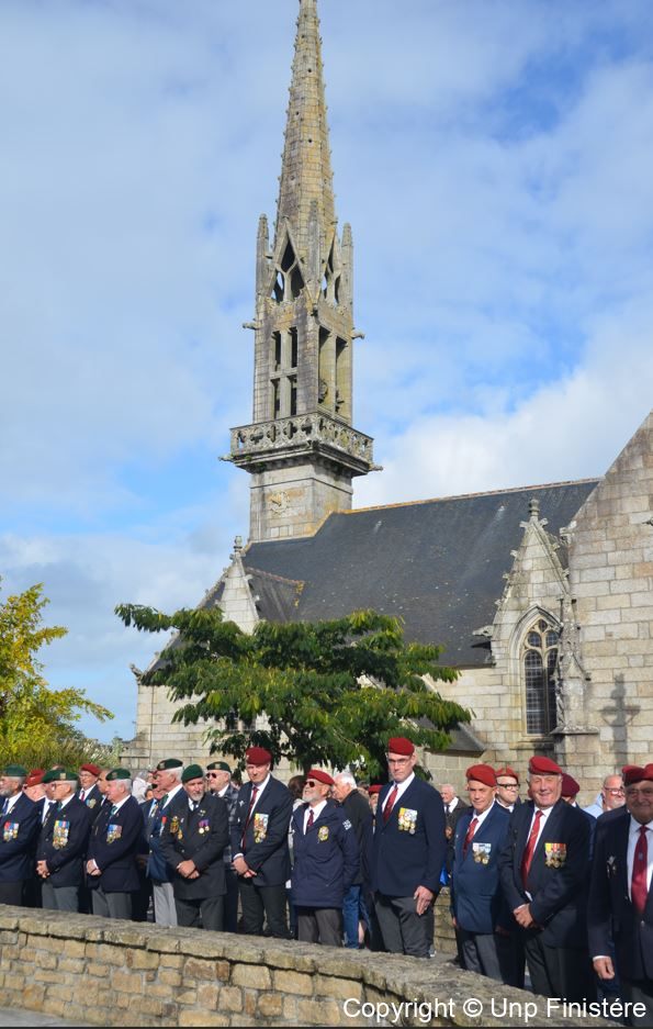 Une première gerbe est déposée par le président de l’UNP29, accompagné du général SALAÜN, de notre grand ancien Roger OUADEC ayant participé à l’opération Castor à Dien Bien Phu, et de Jean-Luc DOREAU président des Anciens Combattants de la commune.