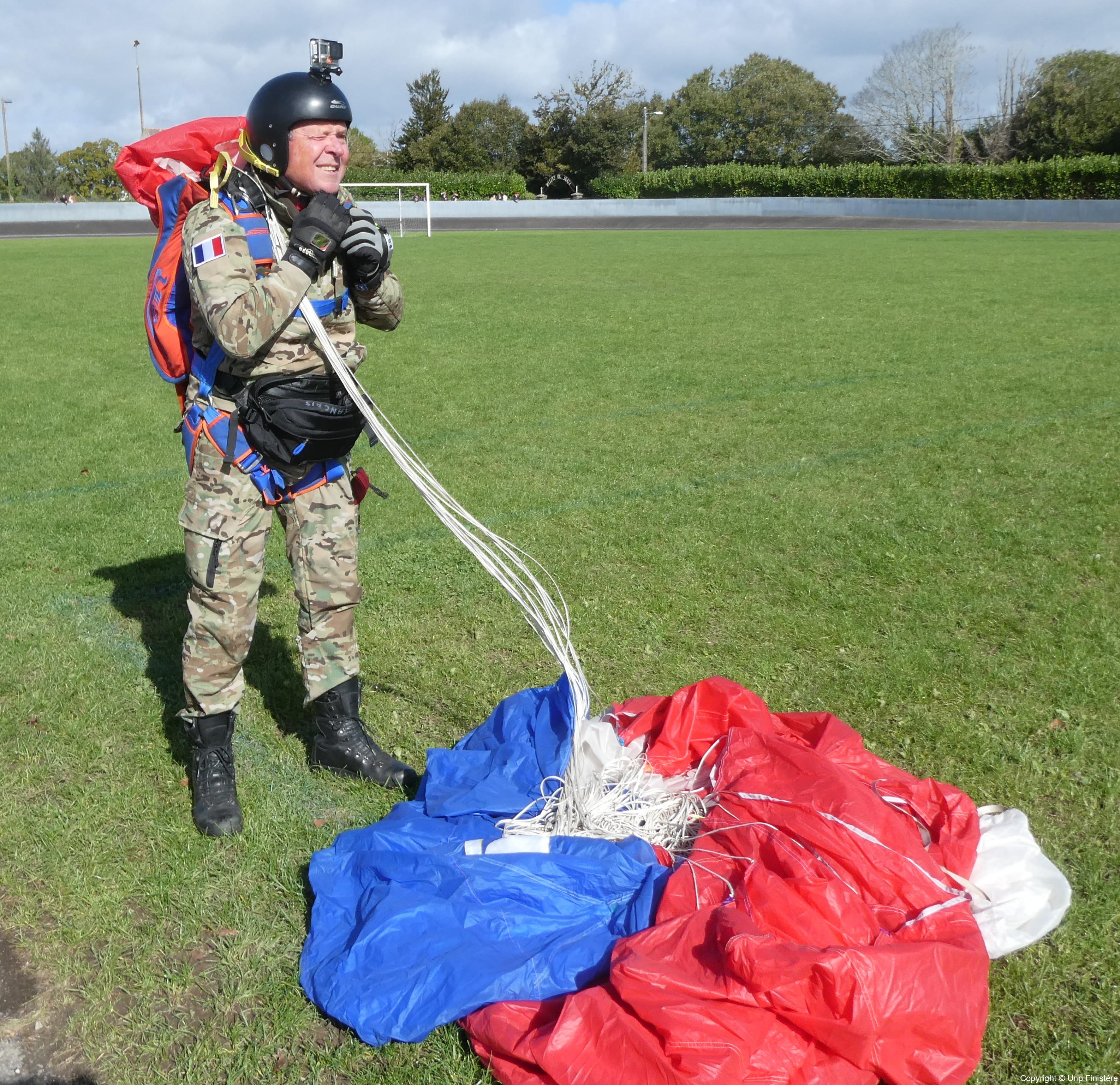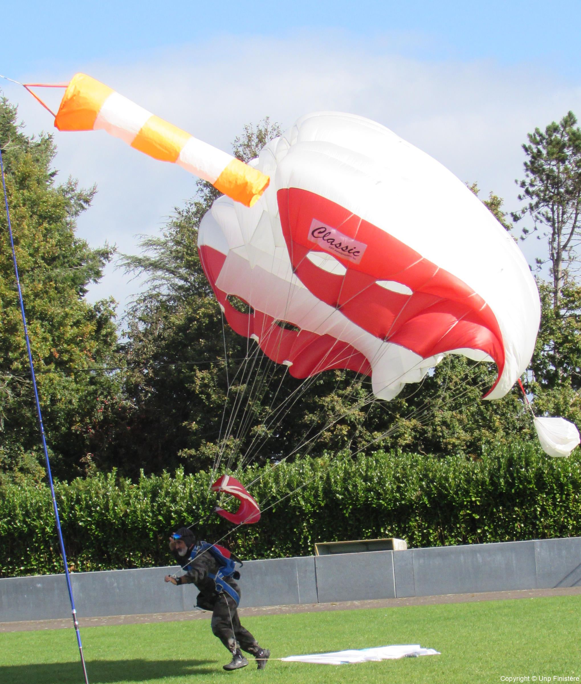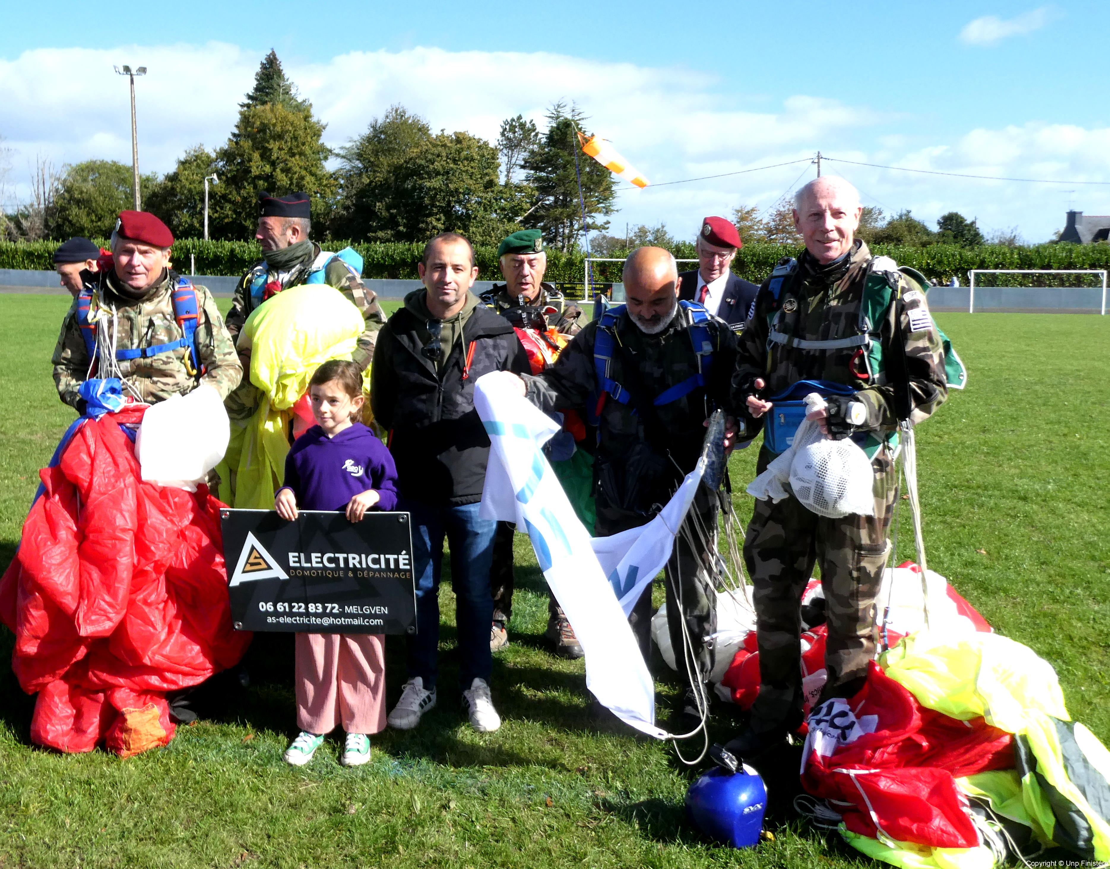 12h45 il est temps de rejoindre le stade afin d’assister au largage des cinq chuteurs de l’école de parachutisme de l’Atlantique de Guiscriff. Parmi eux un para instructeur qui a sur son carnet de saut plus de sept milles sauts. Les conditions de saut sont excellentes, tempête de ciel de bleu et un vent qui permet de travailler un peu lors de la descente sous voile. Le public est bien présent, notamment des jeunes qui assistent pour la première fois d’aussi près à l’atterrissage des paras sur l’excellente pelouse de ce stade. Comme à Plogonnec l’un des chuteurs apportait le ballon du match qui devait se dérouler ce jour-là.
