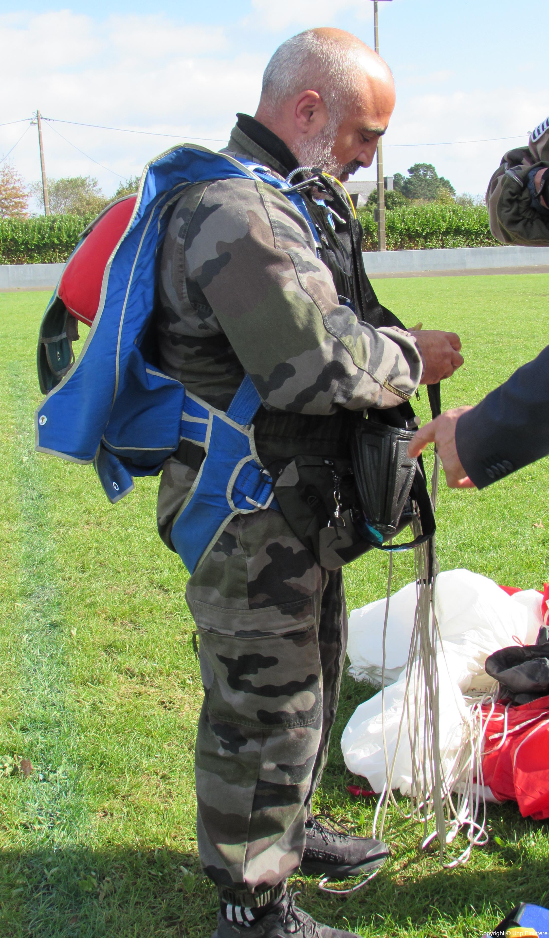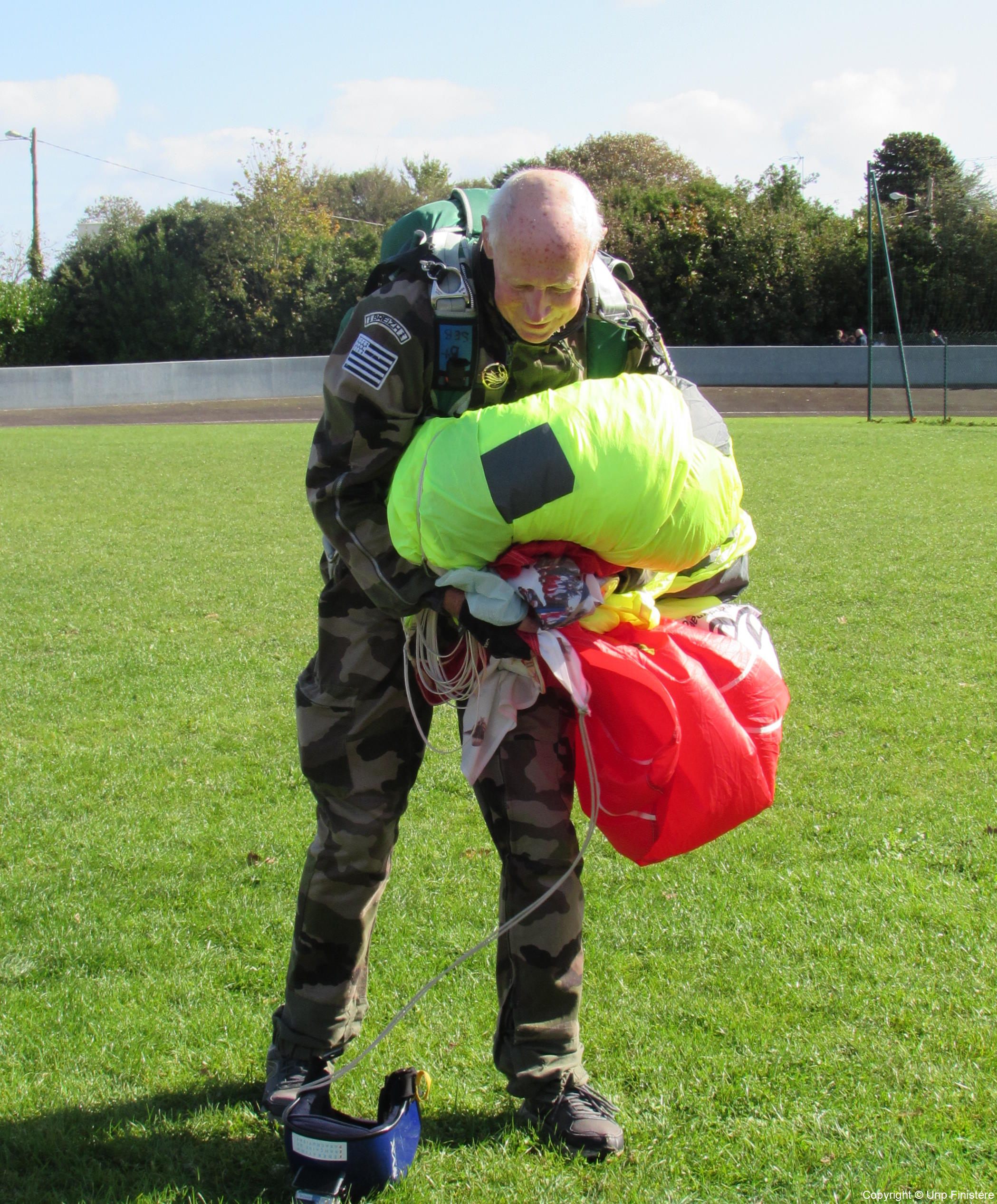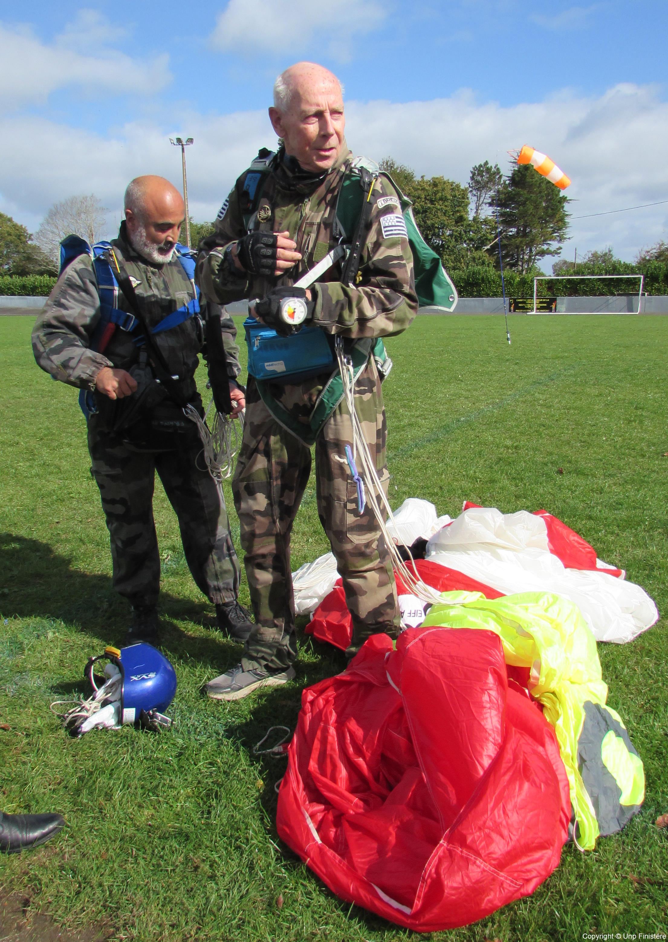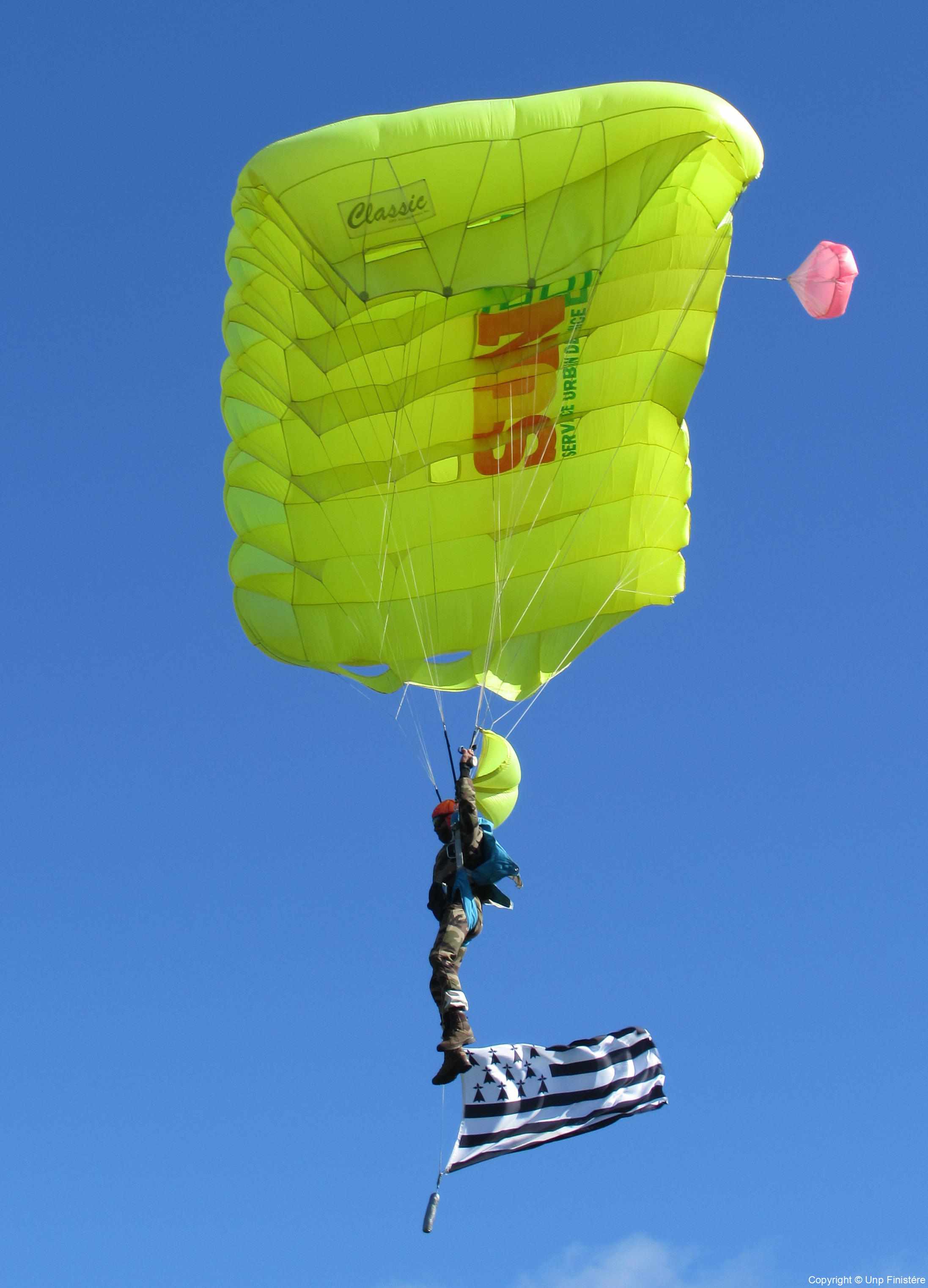 12h45 il est temps de rejoindre le stade afin d’assister au largage des cinq chuteurs de l’école de parachutisme de l’Atlantique de Guiscriff. Parmi eux un para instructeur qui a sur son carnet de saut plus de sept milles sauts. Les conditions de saut sont excellentes, tempête de ciel de bleu et un vent qui permet de travailler un peu lors de la descente sous voile. Le public est bien présent, notamment des jeunes qui assistent pour la première fois d’aussi près à l’atterrissage des paras sur l’excellente pelouse de ce stade. Comme à Plogonnec l’un des chuteurs apportait le ballon du match qui devait se dérouler ce jour-là.